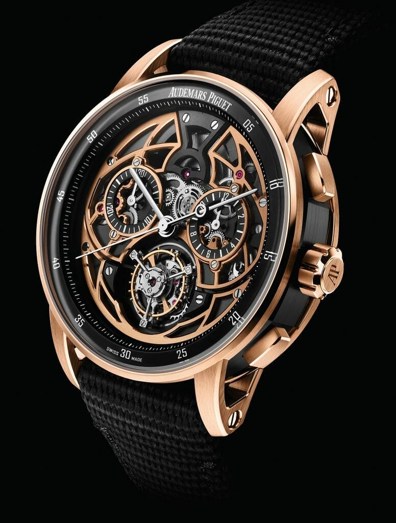 Ce garde-temps compliqué est habillé d’une boîte bicolore en céramique noire et or rose 18 carats soulignant l’architecture complexe de la collection et l’esthétique tridimensionnelle du mouvement.