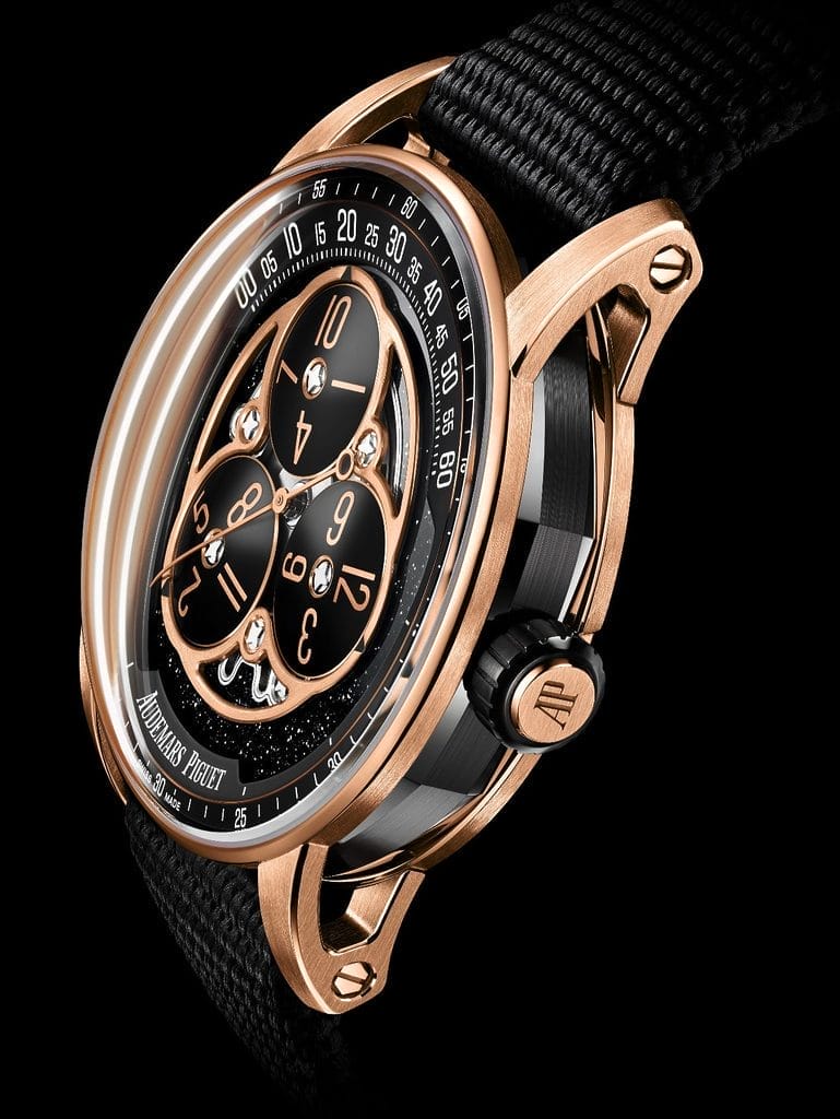 Le design de cette nouvelle édition exprime une modernité affirmée. La boîte de 41 mm associe une lunette et un fond en or rose 18 carats à une carrure en céramique noire, créant un contraste de matières et de teintes qui souligne la géométrie architecturale propre à la collection Code 11.59 by Audemars Piguet. Le cadran en aventurine noire, ponctué de disques en opaline noire et de chiffres dorés, offre une profondeur visuelle captivante, enrichie par les reflets du rotor central.