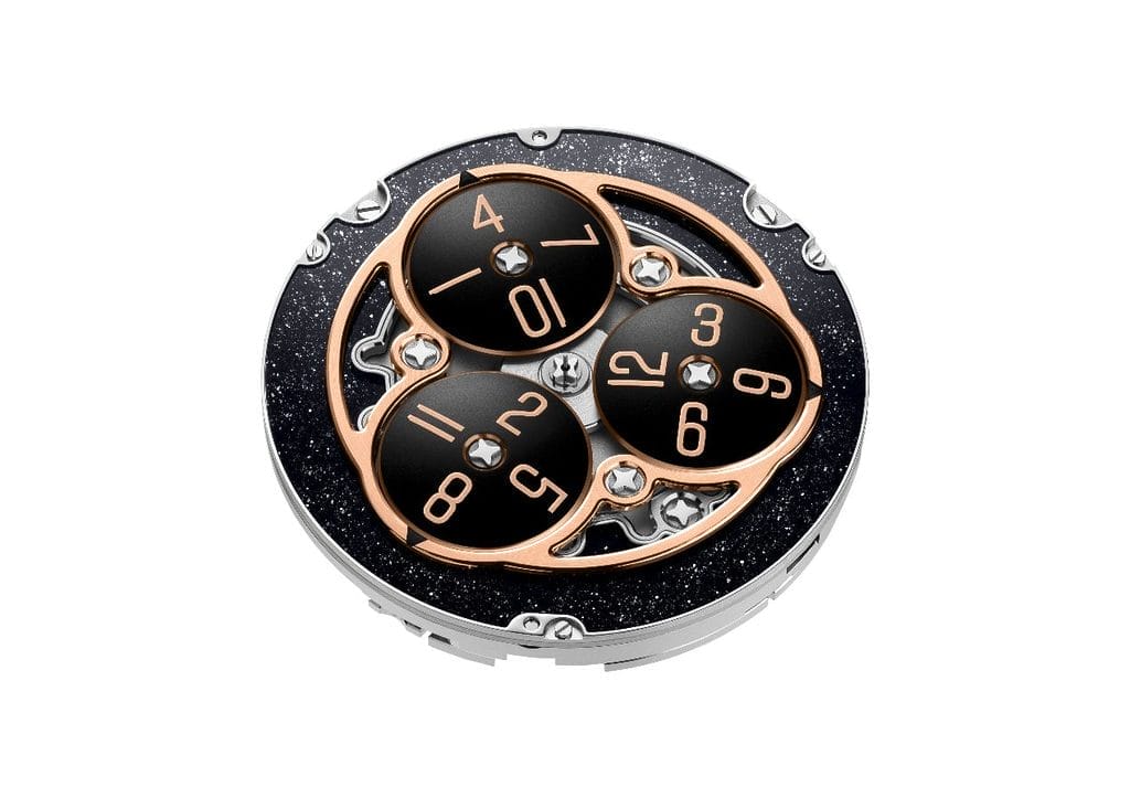 L’affichage repose sur un rotor central effectuant une rotation complète toutes les trois heures. Trois disques en aluminium, chacun portant quatre chiffres de 1 à 12, y sont fixés. Ils tournent sur leur propre axe et désignent tour à tour les minutes sur un secteur de 120 degrés situé dans la partie supérieure du cadran. Une aiguille des secondes en or rose 18 carats, légèrement courbée à son extrémité pour épouser le relief des disques, ajoute dynamisme et fluidité à la lecture du temps. Le résultat est une mise en scène horlogère poétique et contemporaine, où le mouvement semble suspendre le temps.