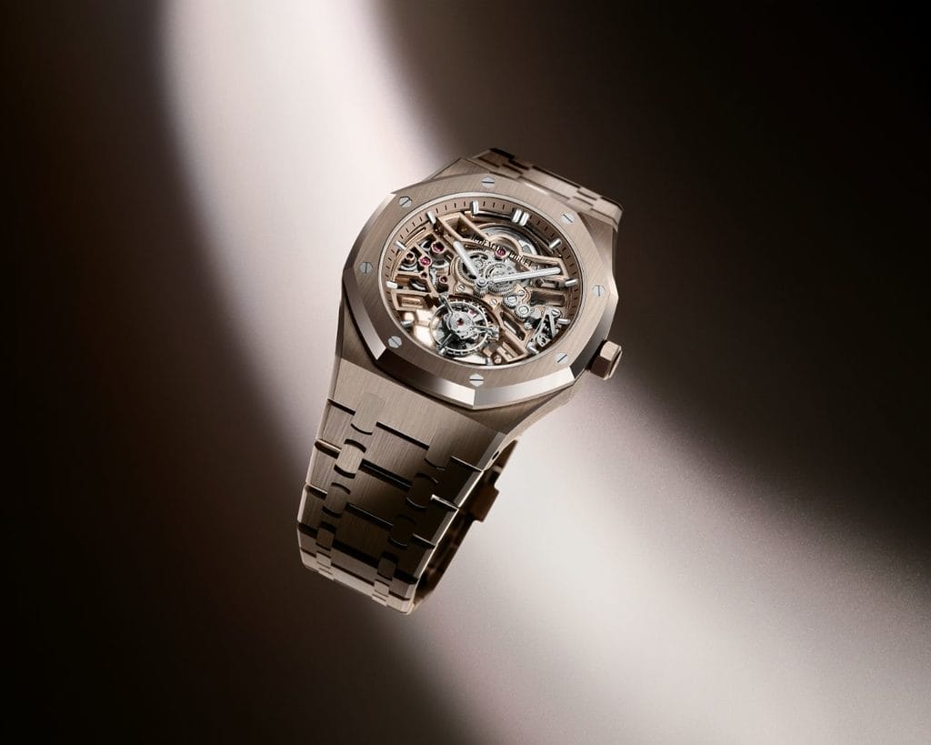 Ce nouveau modèle Royal Oak Tourbillon Volant Squelette Automatique de 41 mm marque l’arrivée du sand gold chez Audemars Piguet. Cet alliage d’or 18 carats qui tire son nom de la couleur des dunes de sable à la lumière du soleil, contient du palladium et du cuivre pour un effet chaleureux. Oscillant entre or gris et rose, il offre une subtile variation de couleur au gré de la lumière. En outre, il fait preuve d’une résistance à la décoloration qui le rend pérenne et intemporel.