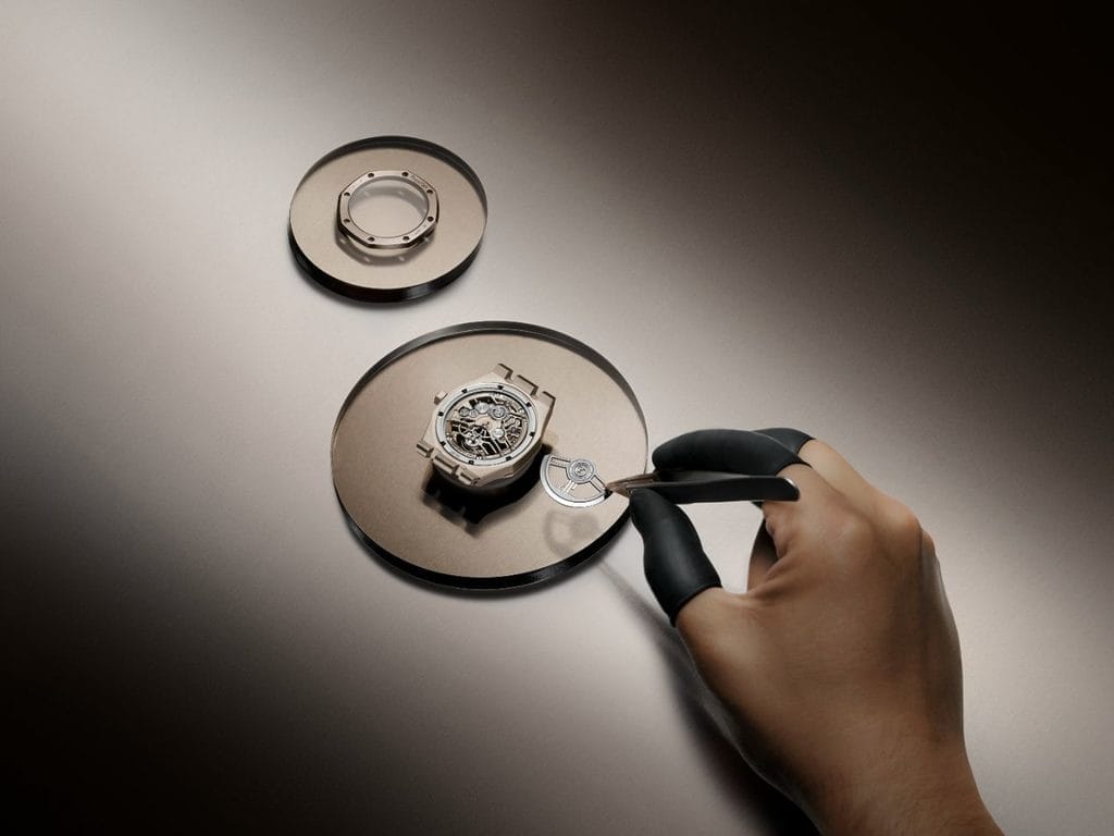 Réhaut de ton sand gold, index et aiguilles Royal Oak en or gris avec dépôt luminescent.