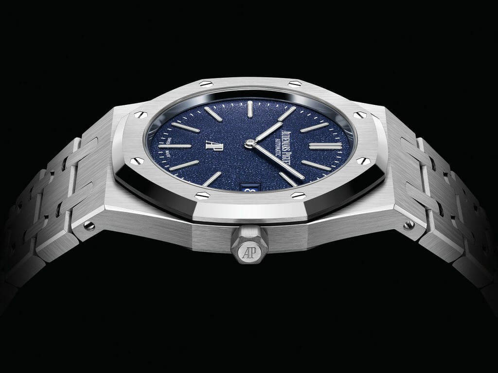 Pour cette nouvelle itération, boîte et bracelet sont en or gris. L’objectif est de favoriser le contraste avec le nouveau cadran grainé bleu ponctué d’index en or gris et survolé par des aiguilles également en or gris, recouvertes d’un dépôt luminescent afin d’augmenter la lisibilité dans l’obscurité. Dans la même optique, le fond du guichet de date est lui aussi en harmonie avec le bleu du cadran. La boîte, quant à elle, présente l’alternance de finitions chère à Audemars Piguet, où les chanfreins polis répondent au satinage déployé sur la lunette et le bracelet à boucle déployante AP.