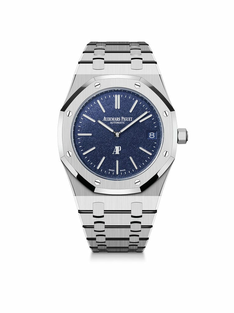 La manufacture suisse de Haute Horlogerie Audemars Piguet est heureuse de révéler une nouvelle version de son modèle Royal Oak « Jumbo » Extra-Plat (ref. 16202) dotée d’un cadran bleu grainé inédit. Cette édition limitée est animée par le Calibre 7121, tout dernier mouvement ultra-plat introduit en janvier 2022 pour le 50e anniversaire de la Royal Oak. La pièce, d’un diamètre de 39 mm, est proposée dans une boîte en or gris et sera disponible exclusivement dans les boutiques Audemars Piguet.