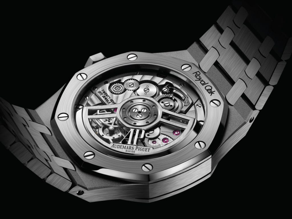 Visible aussi bien sur le cadran qu’au travers du fond de boîte, la cage du tourbillon volant finie à la main offre un point de vue imprenable sur certains des composants régulateurs de la montre qui permettent la rotation. Le fond de boîte met également en valeur les décorations raffinées du mouvement telles que les Côtes de Genève, le satinage, le colimaçonnage, les chanfreins polis à la main ainsi que la masse oscillante en or rose ou or rose rhodié. Façonnée avec le plus grand soin à l’intérieur comme à l’extérieur, la Royal Oak Tourbillon Volant Automatique allie esthétique contemporaine et savoir-faire ancestral.