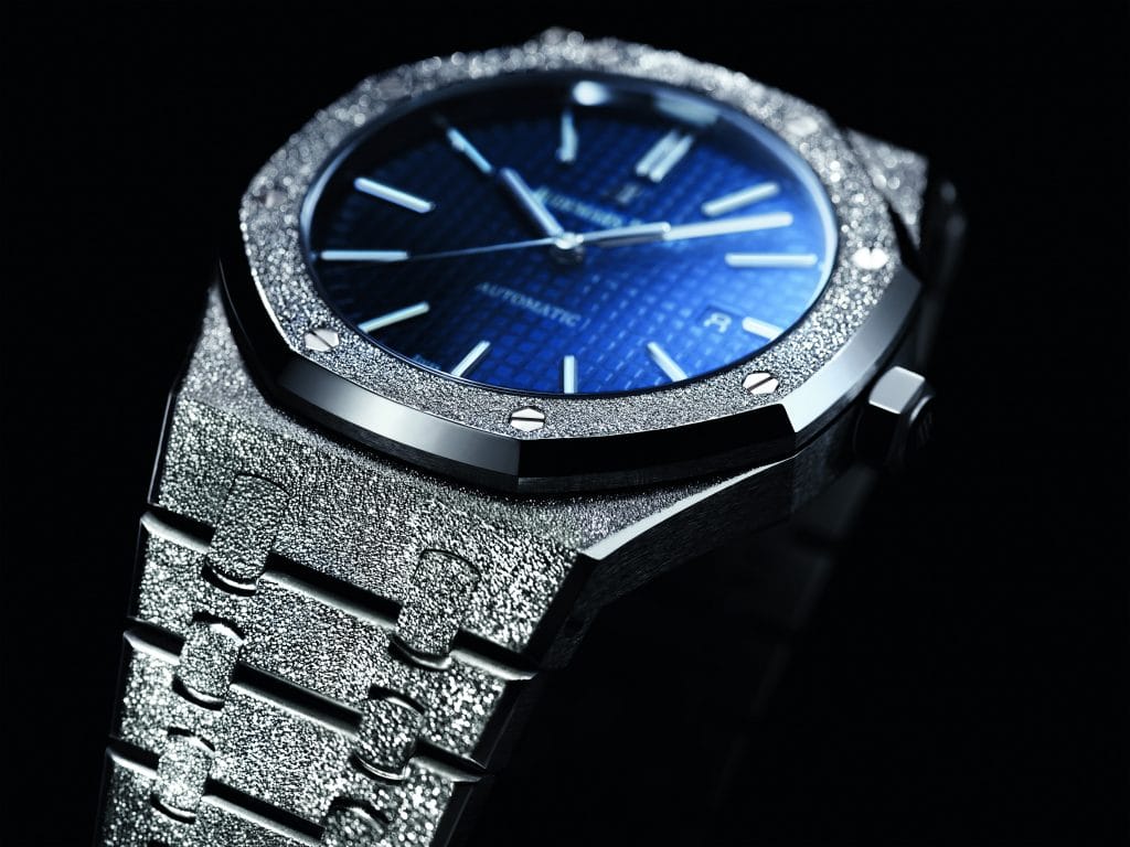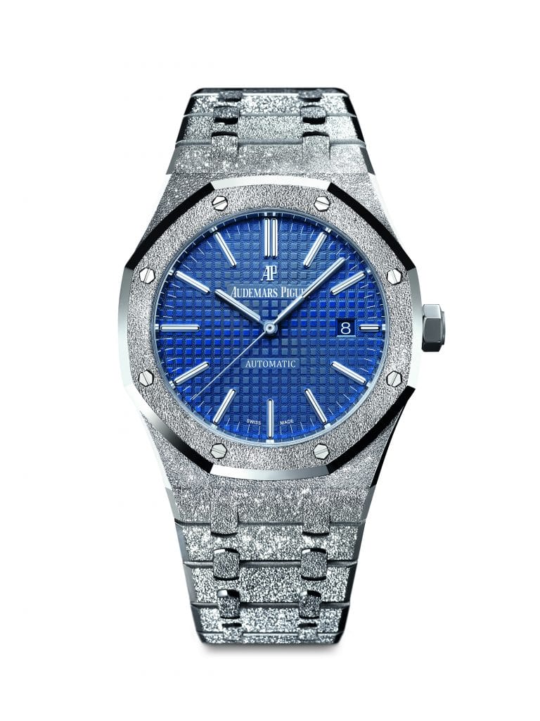 Après le succès du lancement en novembre 2016 de la Royal Oak Frosted Gold, Audemars Piguet dévoile une édition limitée de ce garde-temps. Produite en 200 exemplaires, cette montre est dotée d’un bracelet et d’une boîte de 41 mm en or blanc 18 carats, d’une glace et d’un fond saphir avec traitement antireflet, d’un cadran bleu à motif « Grande Tapisserie » ainsi que d’aiguilles Royal Oak à revêtement luminescent.