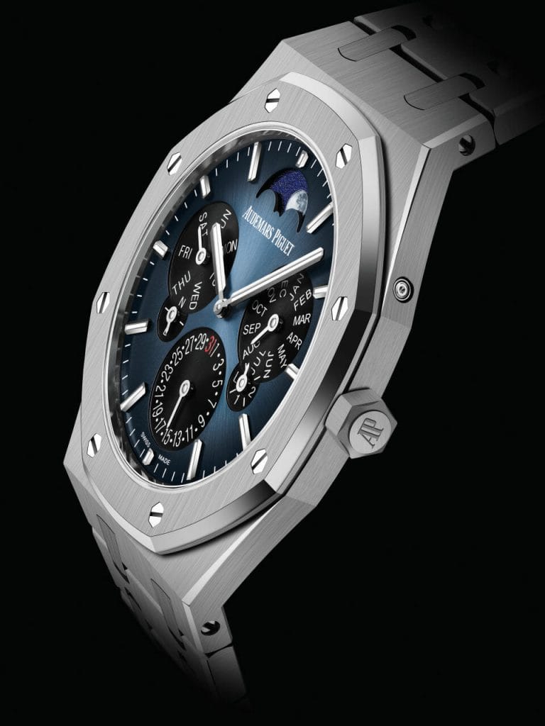 Cette nouvelle itération vient aussi perpétuer la longue tradition des montres à quantième et mouvements extra-plats chez Audemars Piguet. Il y a un siècle, en 1921, la Manufacture inaugurait cette double quête avec la montre de poche la plus fine jamais réalisée (1,32 mm d’épaisseur calibre), suivie d’un record similaire pour, cette fois, une montre-bracelet manuelle (1,64 mm d’épaisseur calibre en 1938) puis automatique (calibre de 2,45 mm en 1967). En 1978, alors que l’industrie horlogère était entièrement tournée vers les développements des montres à quartz, la Manufacture révélait la montre-bracelet quantième perpétuel à remontage automatique la plus fine au monde lors de son lancement (calibre de 3,95 mm).