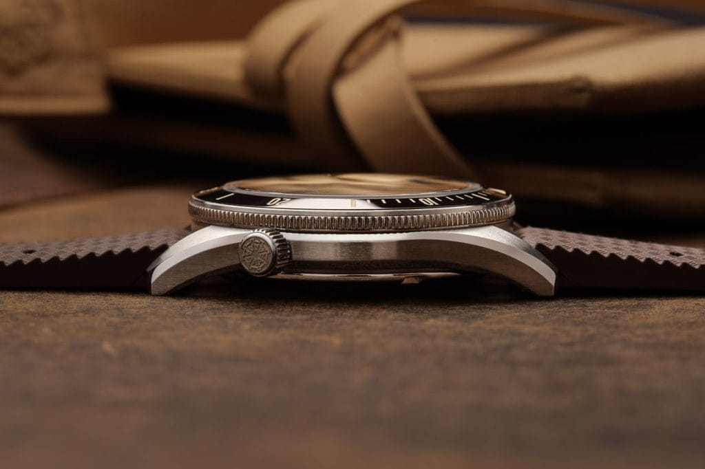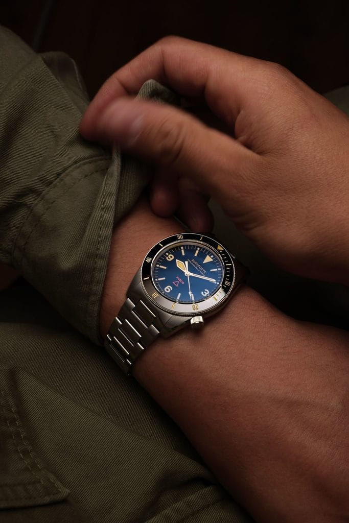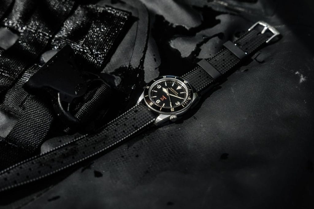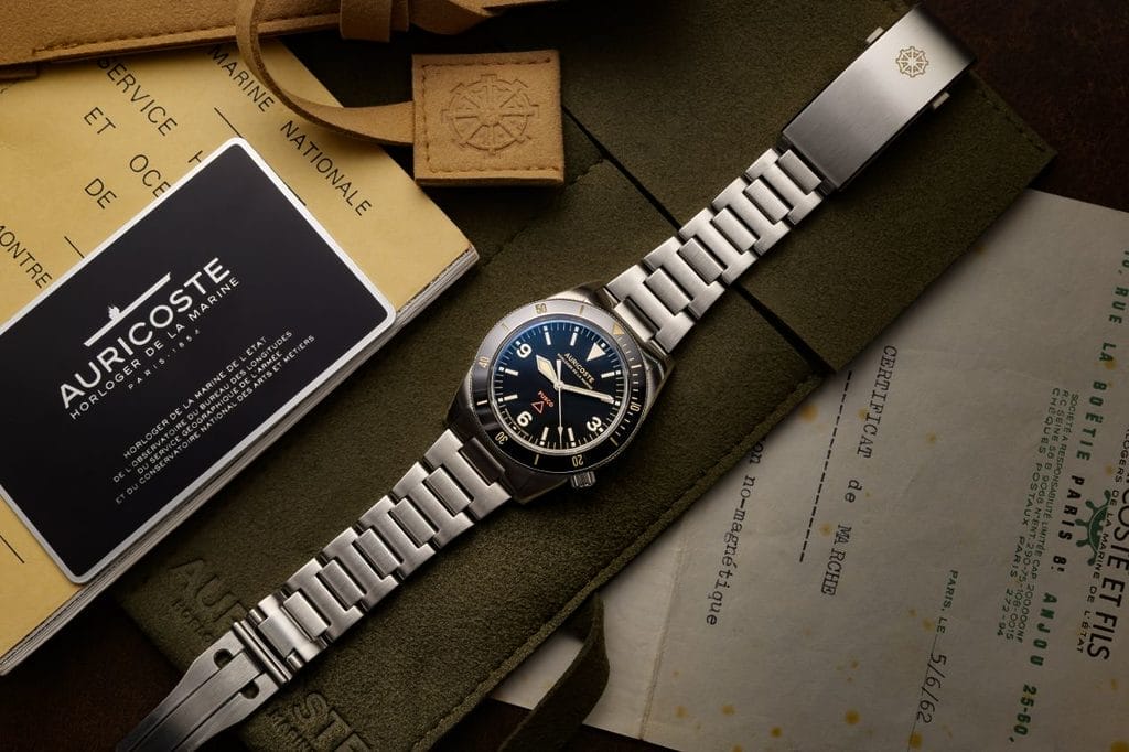 La couronne à 4h, gravée du gouvernail Auricoste, perpétue la signature des plongeuses historiques de la marque. Quant à la lunette unidirectionnelle à 120 clics, coiffée d’un insert en céramique noire, elle se distingue par son profil bas et sa préhension sûre.