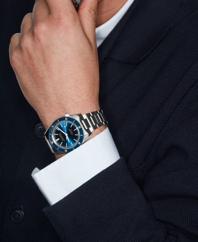Le bracelet acier s’inspire des plongeuses des années 80, avec des maillons en H brossés et une continuité fluide avec le boîtier. L’endlink intégré affirme l’harmonie de l’ensemble.