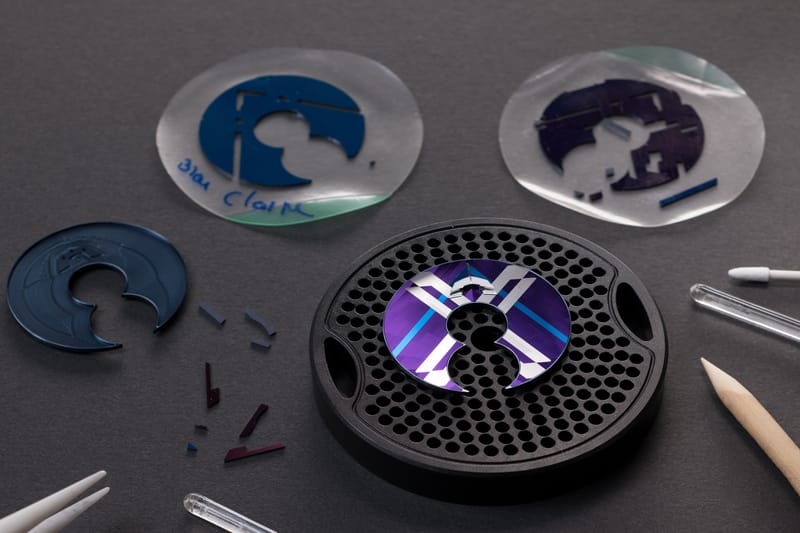 Grande première dans l’histoire de l’horlogerie, la marqueterie de silicium est un assemblage de morceaux de wafers de silicium découpés grâce à un faisceau plasma. Tout l’art de cette technique repose sur la dextérité de l’artisan, le silicium utilisé étant d’une friabilité et fragilité extrêmes lors de la manipulation. Le seul fait de superposer légèrement les morceaux au lieu de les imbriquer suffit à en ébrécher les bords. C’est un véritable « métier d’art technologique » qui consiste en l’assemblage et le collage, à la main, des quelques 120 pièces nécessaires à la création de ces étonnantes mosaïques. L’effet en est inégalable, tant l’œil se trouve comme capturé par les miroitements de la marqueterie, semblables à des rayons lasers.