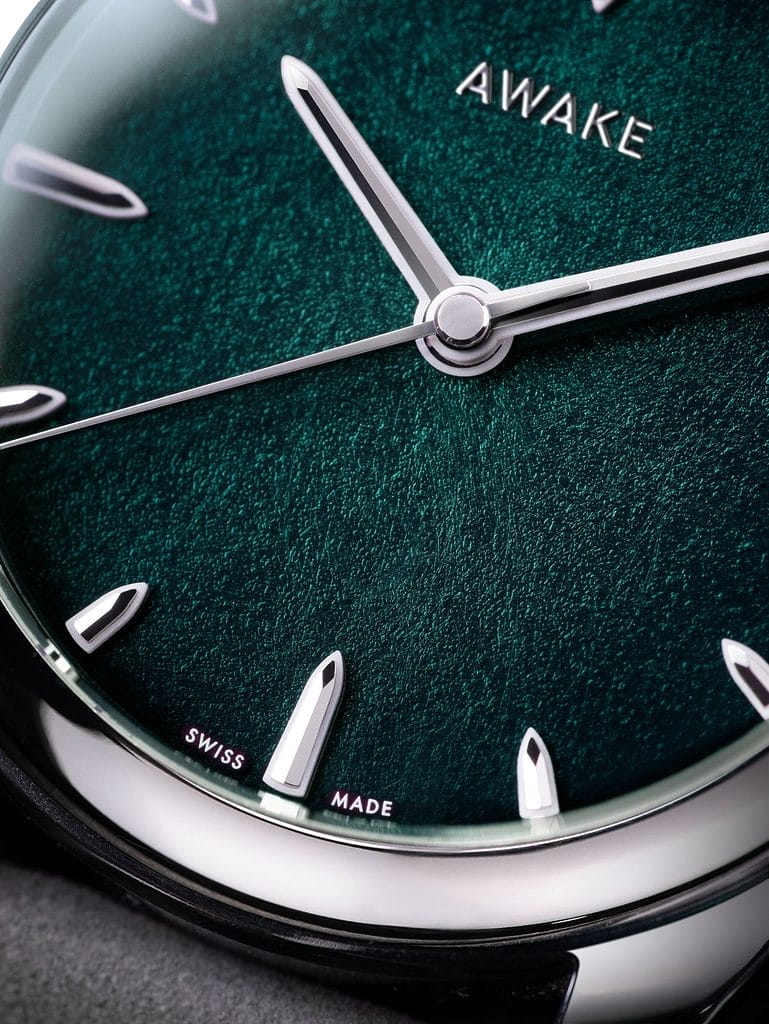 AWAKE utilise des feuilles d’argent pur pour apporter texture et relief à ses cadrans. Chaque cadran est soumis à un processus complexe, exigeant des semaines de travail minutieux, garantissant une qualité et une esthétique exceptionnelles.