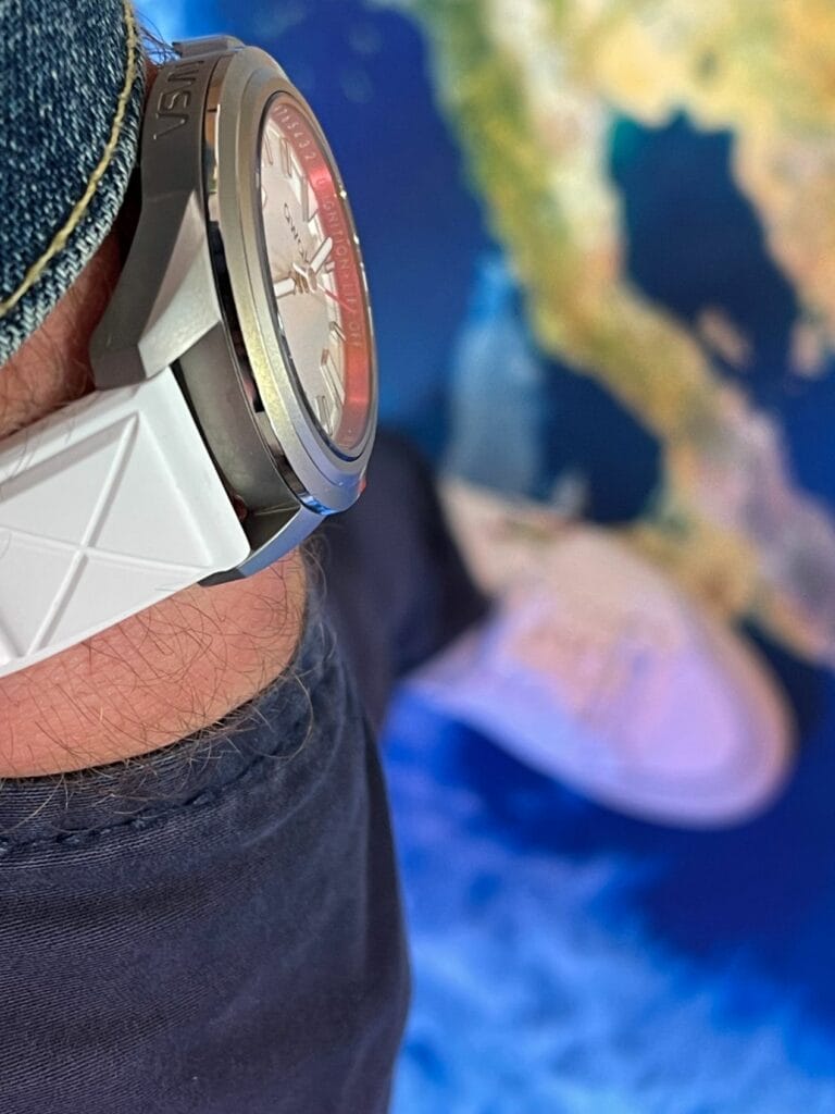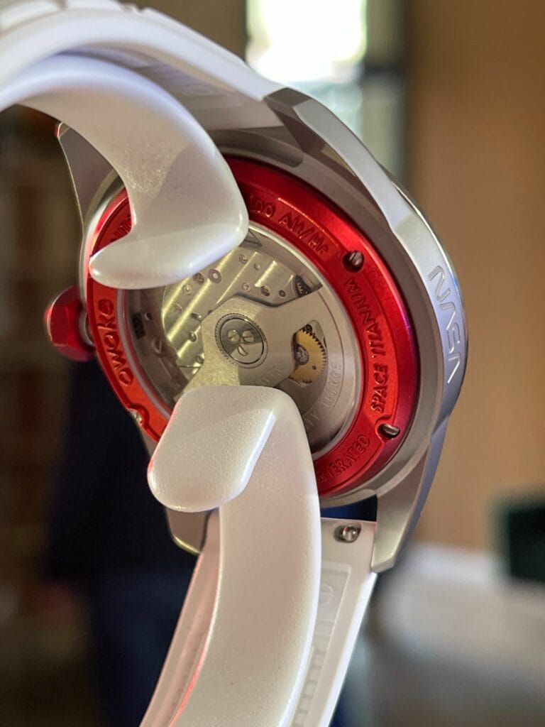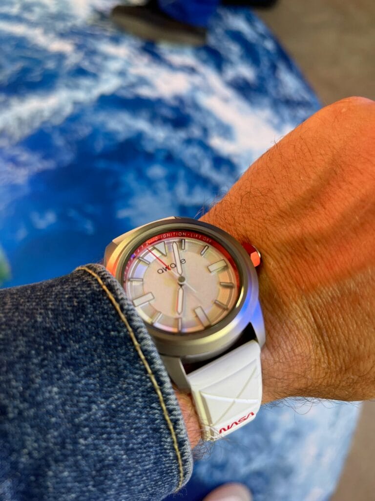 La montre, approuvée par la NASA après dix-huit mois d’attente, présente un cadran gris léger à la finition sablée en forme de la « Cupola », c’est-à-dire la fenêtre d’observation panoramique de l’ISS. Une inspiration que l’on retrouve également sur les index lingots qui rappellent les séparations des six hublots périphériques de la Cupola. Les joints rouges séparant leurs multiples couches de verre résistantes aux micro-météorites trouvent leur écho dans le rehaut en aluminium gravé du mythique compte à rebours précédant chaque décollage de fusée. La minuterie crantée reprend quant à elle les traces laissées par les Rovers sur les astres qu’ils découvrent, tandis qu’un guillochage concentrique entre les index rappelle le mouvement de la terre en orbite autour du soleil, ici représenté par le pivot central des aiguilles qui s’inspirent de la forme oblongue caractéristique des fusées. Parée d’une boîte de 40 mm en titane recyclé, la « Mission To Earth » s’anime d’un calibre automatique Miyota 9015 dont la masse oscillante a été retravaillée afin de reprendre le message « Dare Mighty Things » (« Osez des grandes choses ») encodé dans le parachute de Persévérance, le Rover ayant atterri sur Mars. Accompagnée d’un authentique fragment de météorite certifié provenant de l’astéroïde Vesta – vieux de plus d’un milliard d’années – la montre, limitée à 250 exemplaires, se complète d’un bracelet exclusif en Biopoly, un matériau issu du ricin. Léger et résistant, il présente une finition matelassée blanc immaculé rappelant les tenues utilisées par les astronautes lors de leurs sorties extra-véhiculaires dans l’espace.
