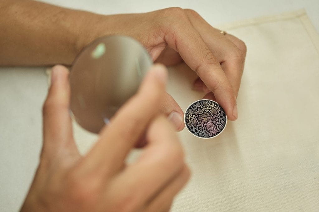 Chaque cadran est une œuvre faite main, nécessitant plus de 15 heures de travail minutieux, entre les couches successives de laque naturelle, le ponçage, le polissage et la peinture finale. Le motif reptilien, hypnotique, peint à la main par The Dial Artist, évoque à la fois les écailles du serpent et une vibration presque cosmique.