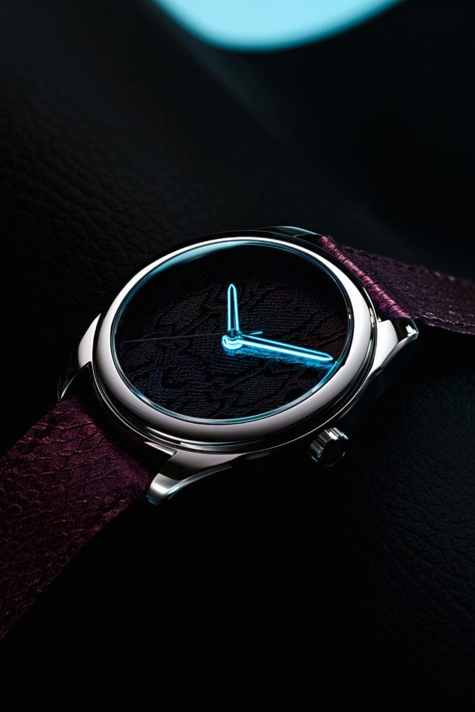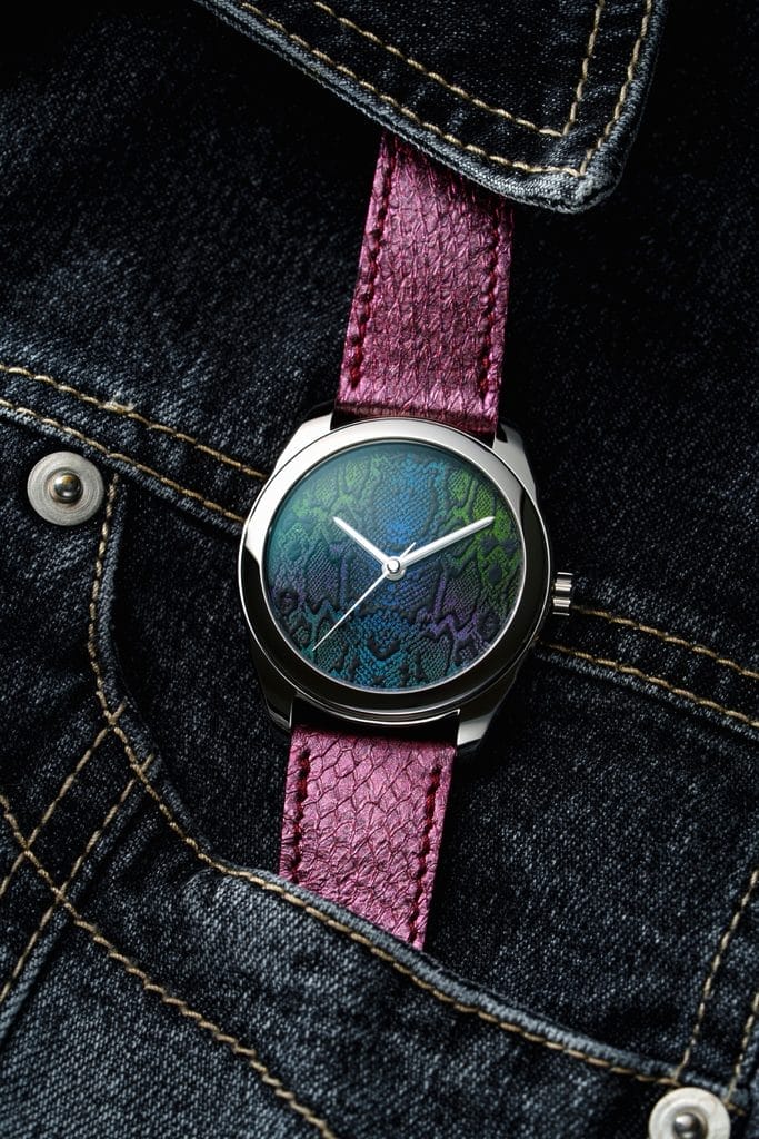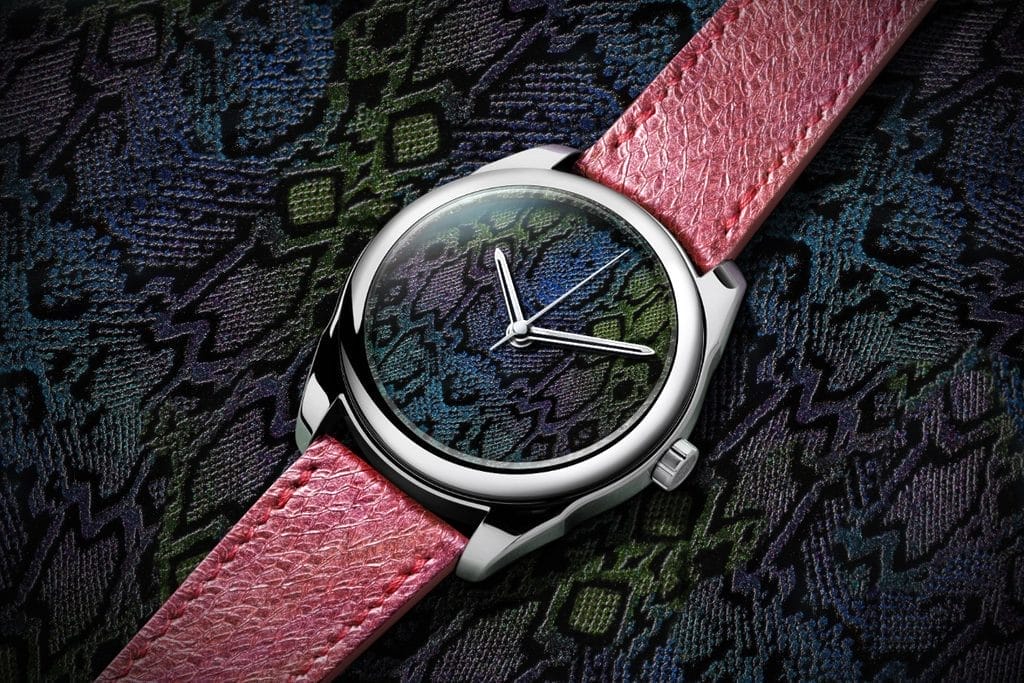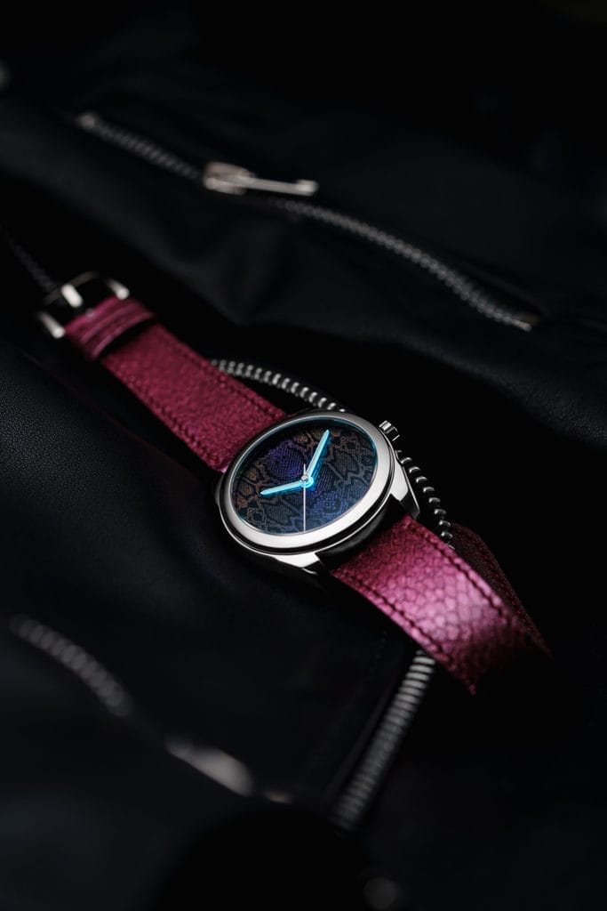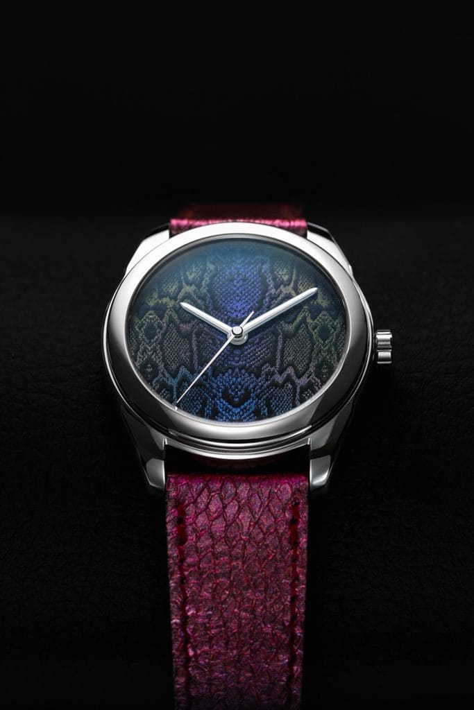 Ce choix de matière n’est pas anodin : le serpent, figure de mue et de renaissance, trouve ici un écho dans la transformation progressive du cadran. L’horlogerie devient alors un terrain d’expression pour un artisanat millénaire, adapté à une montre d’avant-garde.
