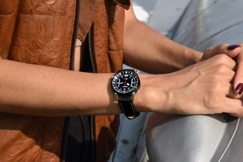 Alors que les modèles AÉRO-6 TAILPLANE et AÉRO-8 CHRONOHORIZON possèdent un boîtier d’un diamètre de 44 mm, L’AÉRO-2 ALTITUDE est quant à elle une montre dotée d’un boîtier plus petit de 34 mm de diamètre. Elle se différencie également en proposant des cornes de couleur grise contrairement au noir arboré sur les deux autres modèles de cette collection.