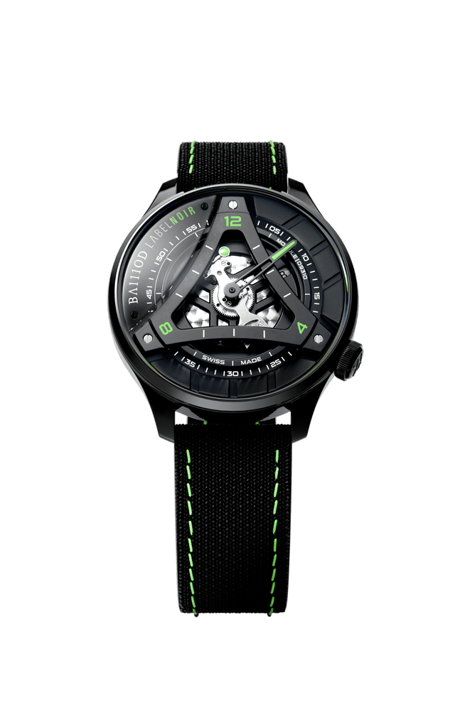 Ouvrant de nouveaux horizons dans l’univers de l’horlogerie de luxe personnalisée, BA111OD s’associe à Label Noir et dévoile, dans une collaboration exclusive, limitée à 111 pièces numérotées, CHPTR_Δ.5 Label Noir Limited Edition (se prononce Chapitre Delta). A cette occasion, la maison genevoise spécialisée dans la customisation a revisité la complication manufacture de l’horloger neuchâtelois, la parant d’un noir profond, alternant brillance et mat intense dans un élégant jeu de lumière accentué par un vert acidulé – délicatement dispersé sur les chiffres et la pastille des heures, l’aiguille des minutes, ainsi que sur les surpiqûres du bracelet en textile – qui vient délicatement sublimer la lecture asymétrique du temps. Cette interprétation inédite de l’heure mêlant un affichage circulaire des minutes à un affichage hypocycloïdal des heures, transforme la lecture de l’heure en une expérience chorégraphique, capturant une temporalité alternative qui incarne le carrousel de la vie.