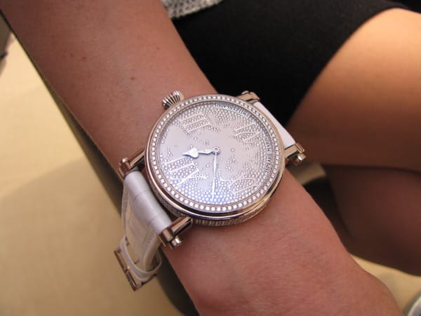 Malgré une boite en or massif, l’épaisseur des saphirs et le fait que la montre soit étanche, la répétition présente une belle musicalité et un niveau sonore très satisfaisant. D’après Peter, sans la boîte, le volume sonore est tout simplement incroyable. On a aucun mal à le croire….