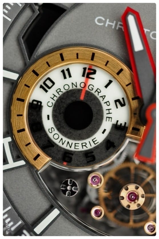Afin de remédier à cela, il a conçu un chronographe précis, grâce à la force constante, et bénéficiant d’un timbre cathédrale pour la sonnerie que l’on peut voir à 10 heures. Un concept inventé et développé en interne pour la DualTow.