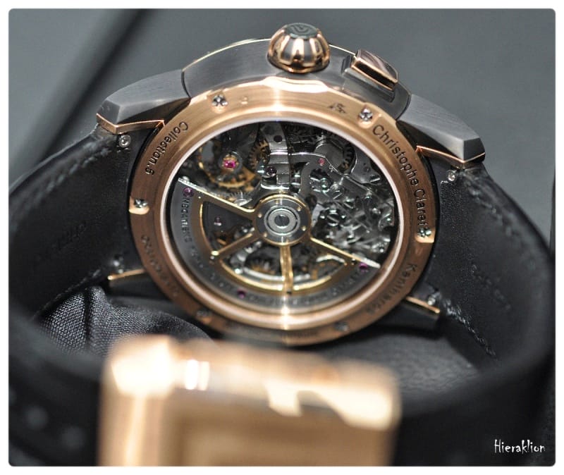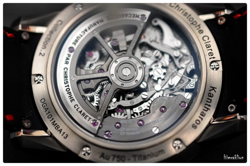 Il est à noter que le système d’embrayage à « double flasques » est inspiré des boîtes de vitesse dans l’automobile. Il permet d’éviter le saut de l’aiguille au démarrage du chronographe et ainsi d’augmenter sa précision. Comme nous l’indique Christophe Claret, « ce dispositif joue sur l’interactivité sensorielle – manuelle et acoustique – entre la montre et son détenteur ».