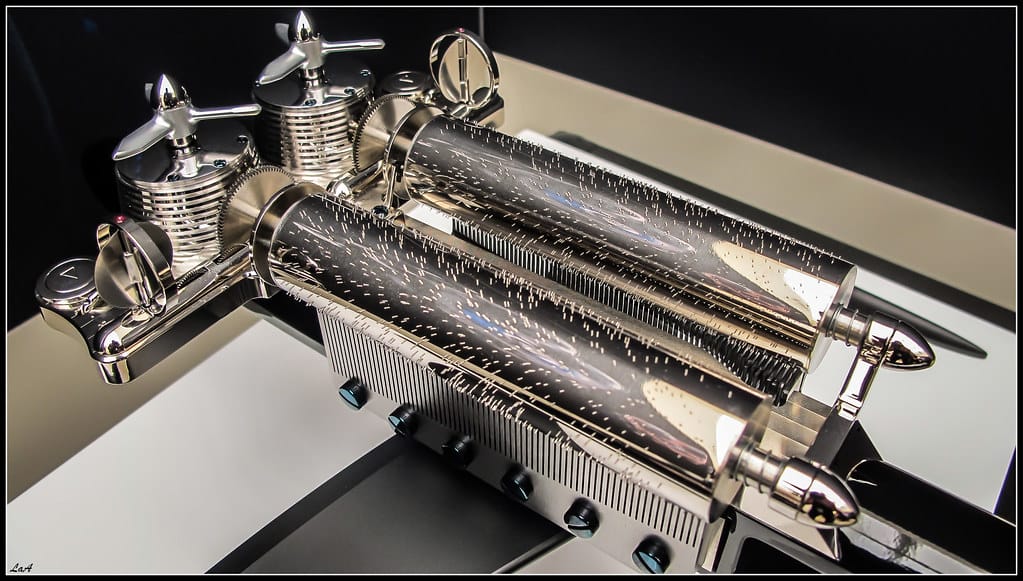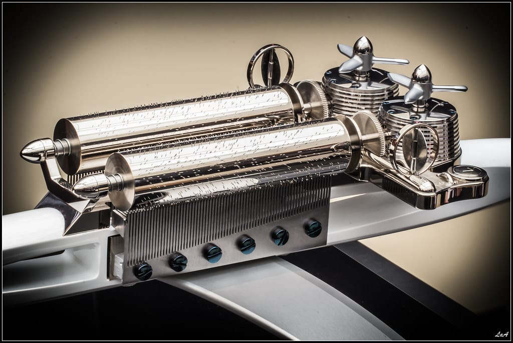Le résultat est impressionnant : ce ne sont pas un mais deux rouleaux musicaux qui composent le corps de la Music Machine dans une symétrie parfaite. Chaque cylindre est garni de picots placés de manière ultra-précise qui vont activer l’ensemble de 72 lamelles de hauteurs de son différentes pour composer pas moins de 3 mélodies ! C’est Maximilian Büsser lui-même qui a fait un retour vers le passé pour sélectionner les morceaux qui ont accompagné ses années de jeunesse (et les nôtres par la même occasion).