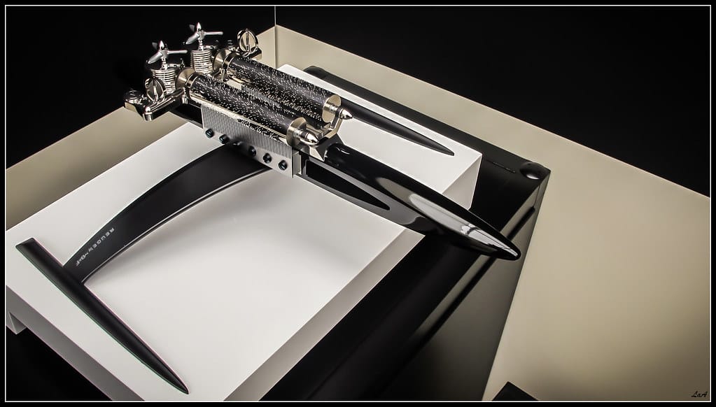 Version « Dark Side » avec son fuselage en noyer laqué noir. Les patins d’atterrissage sont en aluminium.
