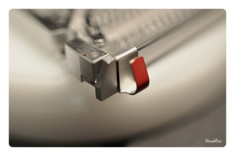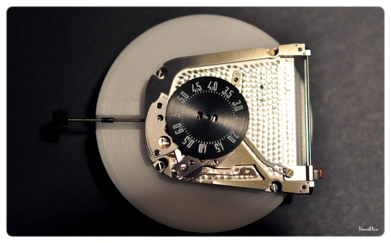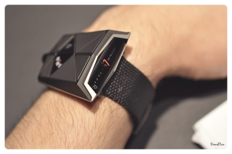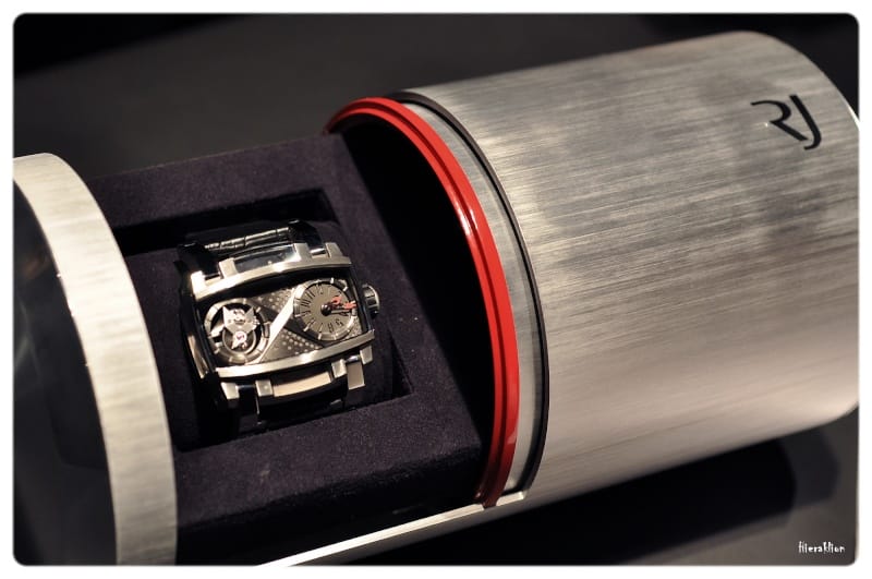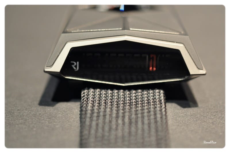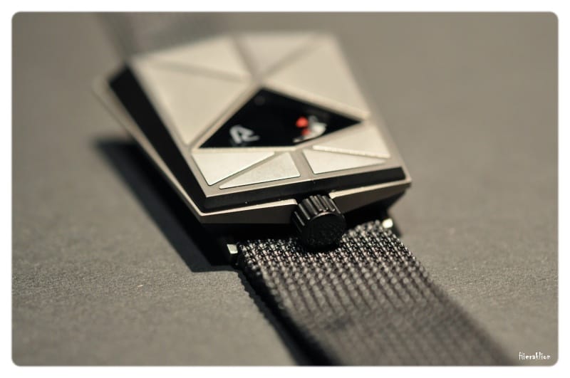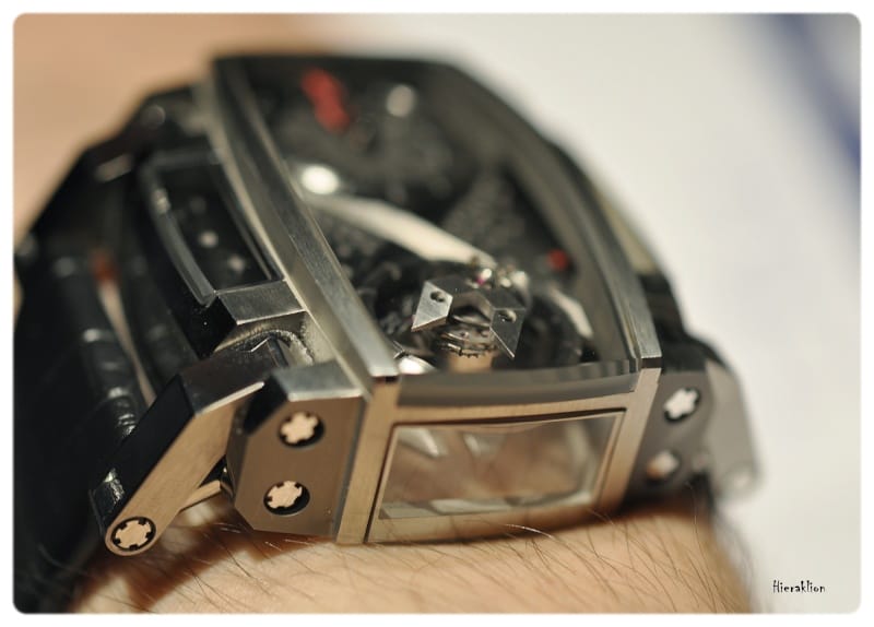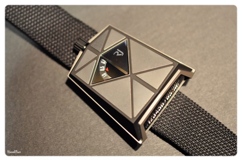 Comme nous avons pu l’apprécier « il est composé d’un chariot qui, entrainé par un ressort, permet l’affichage de l’heure sur la tranche de la montre grâce à un curseur laqué de couleur rouge qui se déplace toutes les 60 minutes sous la glace saphir métallisée. La minute trainante, matérialisée par un disque noir, est lisible sur le dessus de la boîte où sont également rapportées des plaques en titane microbillé. La mise à l’heure se fait par le biais d’une couronne vissée à 12h ».