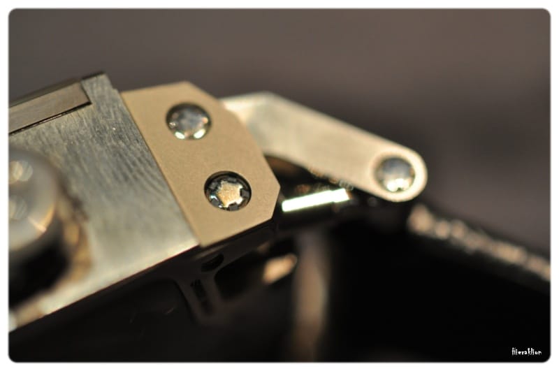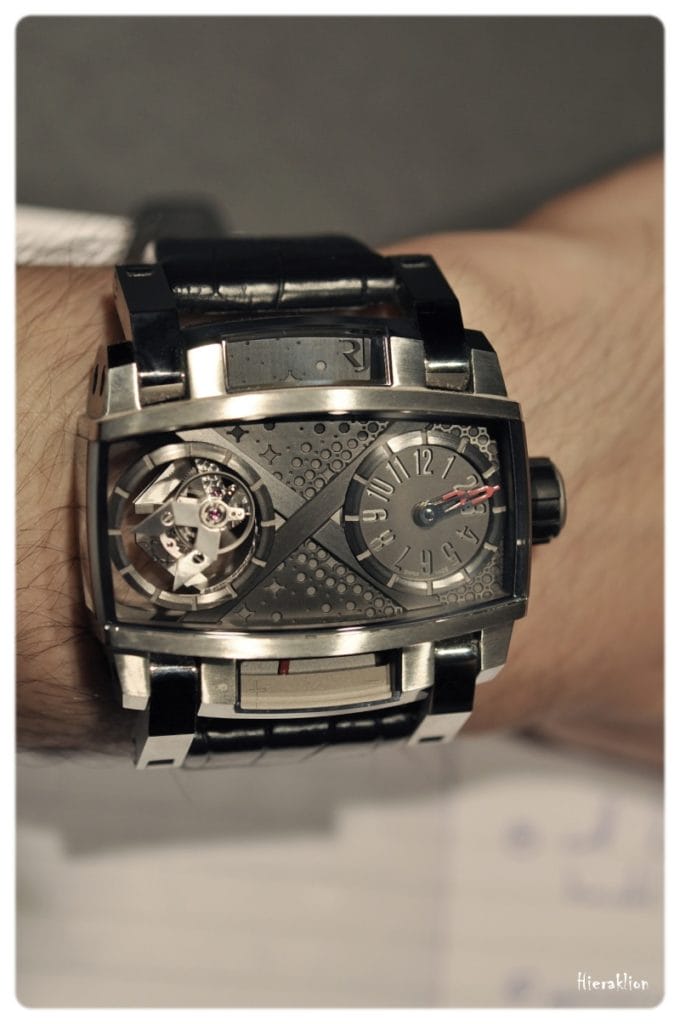 Malgré ses proportions généreuses la montre est très confortable sur le poignet grâce à l’utilisation d’un système de vérins à ressort au niveau des cornes de la montre. Ils se dilatent ou se contractent permettant un ajustement parfait. Il est à noter qu’un tel système est une première mondiale sur un garde-temps.