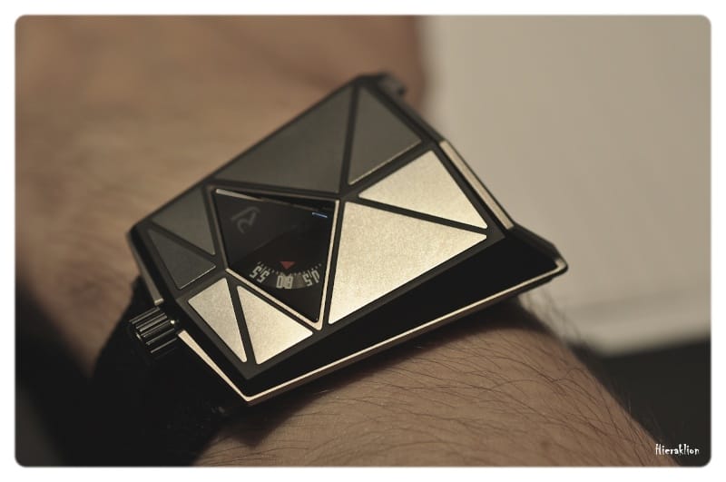 Son profil et sa surface facettée s’inspirent de l’esthétique des vaisseaux spatiaux. Un disque rotatif, placé sur le dessus de la boite, de couleur noire avec un indicateur rouge marque les minutes de façon lente. Les heures, quant à elles, apparaissent latéralement. Elles sont sautantes et rétrogrades.