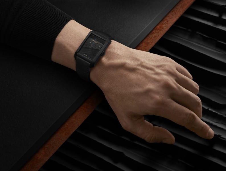 Pour intensifier la profondeur chromatique de la montre, celle-ci est accompagnée d’un bracelet intégré interchangeable noir en cuir toutes écailles carrées avec finition nubuck fermé par une boucle ardillon en acier DLC.