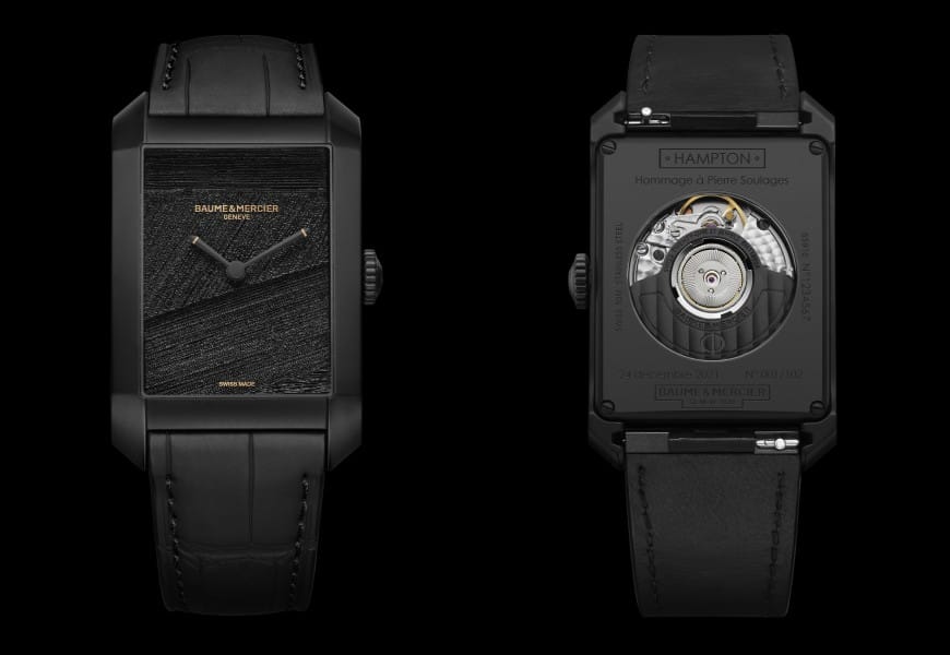 Baume & Mercier est fière et honorée de rendre hommage à l’un des grands maîtres de la peinture en s’inspirant de l’ensemble de son œuvre pour réaliser un garde-temps unique, une création originale : la Hampton « Hommage à Pierre Soulages ».