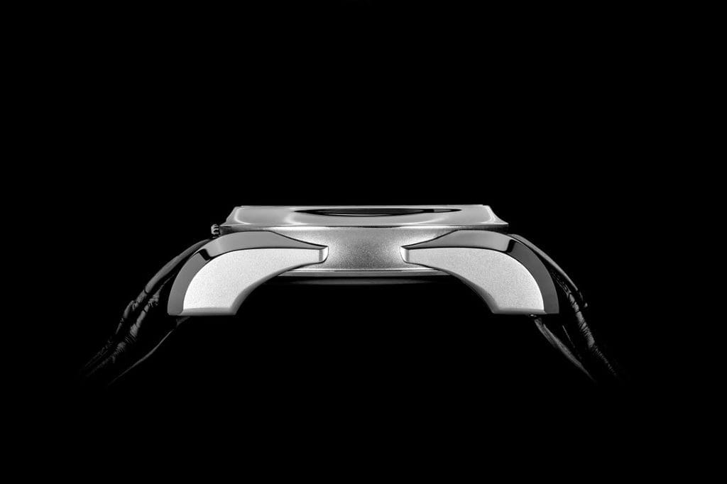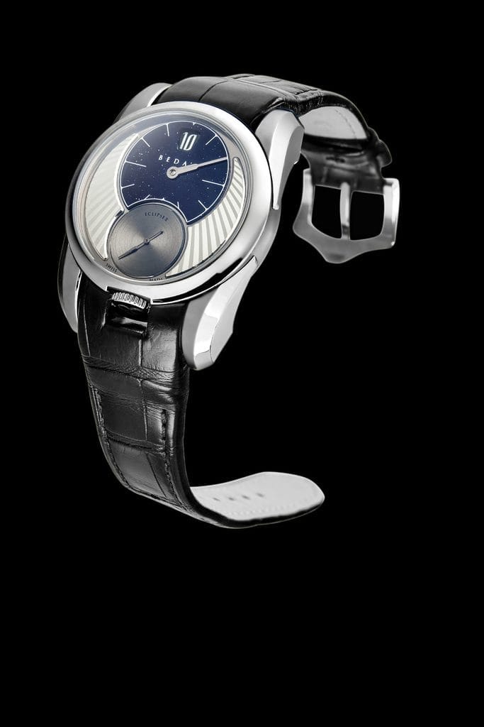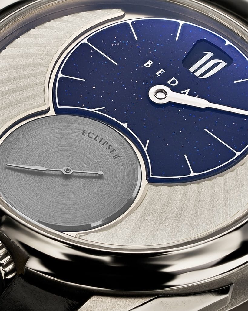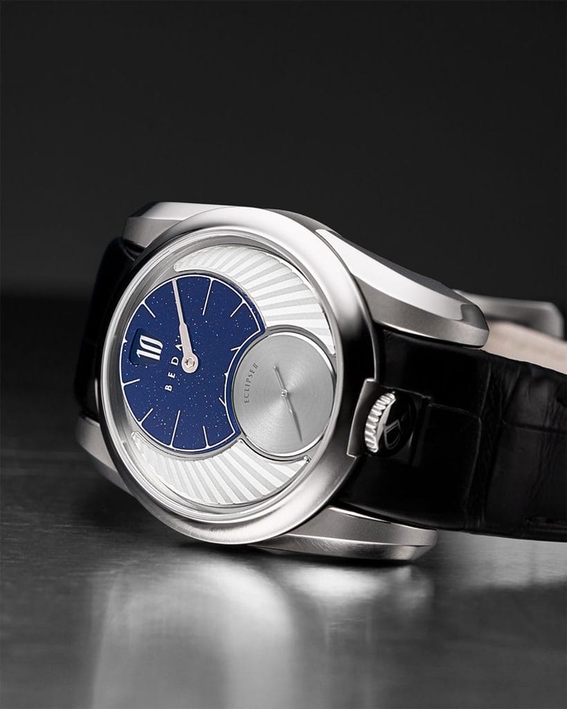 L’Eclipse II met en avant un affichage élégant et atypique, basé sur l’harmonie entre lignes droites et courbes. Une ligne verticale relie à midi les heures et minutes décentrées, une petite seconde indépendante et une couronne positionnée à 6 heures, une rareté. Les deux cadrans imbriqués forment un « 8 » dans une boîte ronde, une exception chez Beda’a.