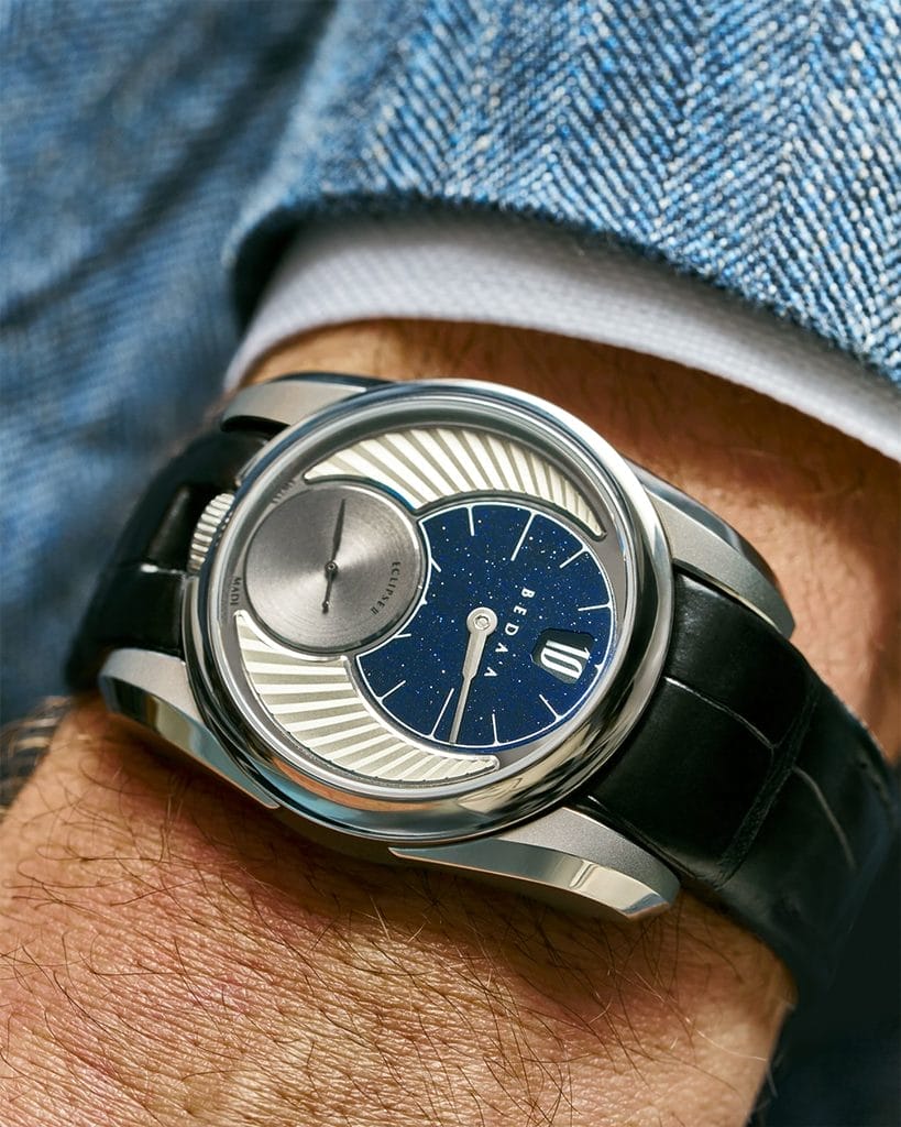 Le mouvement de l’Eclipse II a été conçu en réponse aux attentes des collectionneurs, en combinant performance technique et prix maîtrisé. Il repose sur une base Sellita SW300, enrichie par un module développé spécialement pour Beda’a par Dubois Depraz, une maison reconnue pour son expertise en complications horlogères. Le résultat est un boîtier de 37 mm de diamètre pour seulement 9,5 mm d’épaisseur.