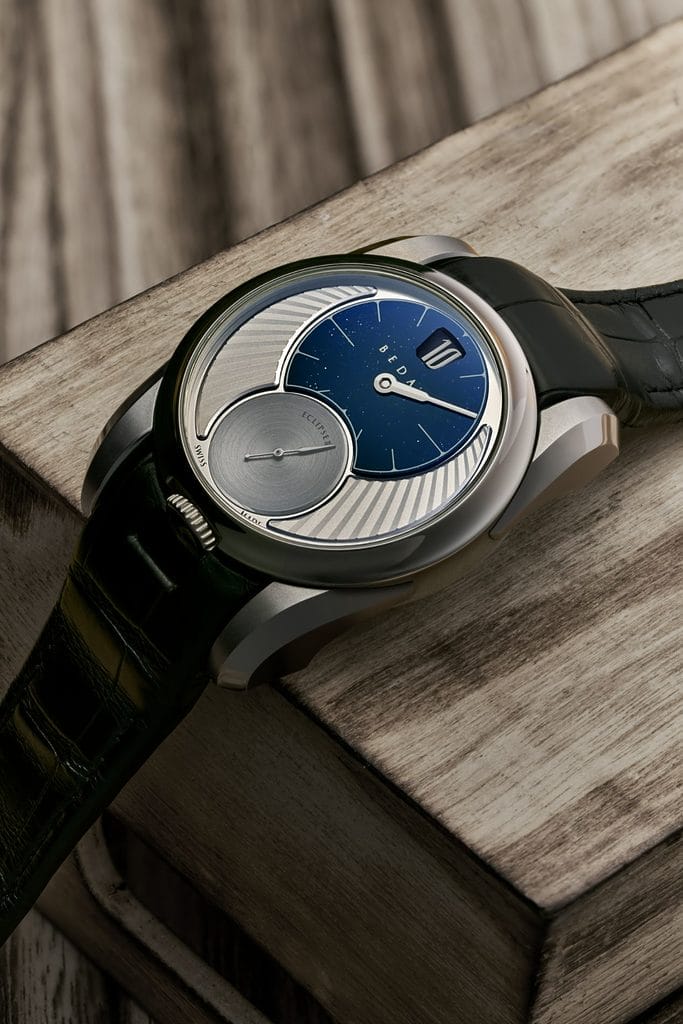 L’Eclipse II met en avant un affichage élégant et atypique, basé sur l’harmonie entre lignes droites et courbes. Une ligne verticale relie à midi les heures et minutes décentrées, une petite seconde indépendante et une couronne positionnée à 6 heures, une rareté. Les deux cadrans imbriqués forment un « 8 » dans une boîte ronde, une exception chez Beda’a.