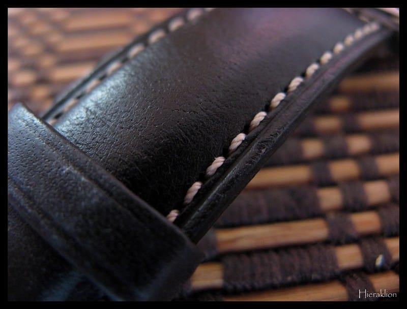 Visitons maintenant le bracelet en cuir marron d’origine, avec des coutures beiges rappelant le cadran :
