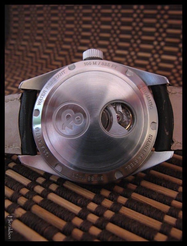 Allons vers le verso, avec tout d’abord une vue globale où l’on voit le symbole Bell & Ross, le traitement du mouvement ainsi que les marquages :