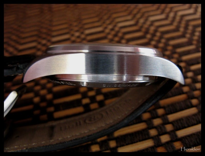 Du boitier vu de côté avec le verre saphir bombé traité antireflet et la corne. On perçoit le côté brossé de cette partie de la boite :