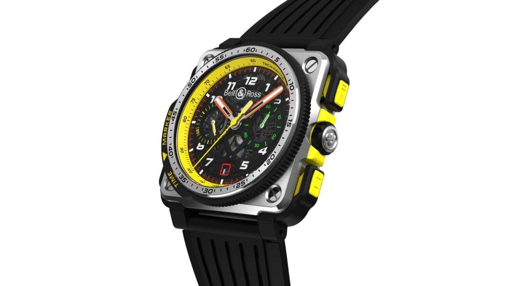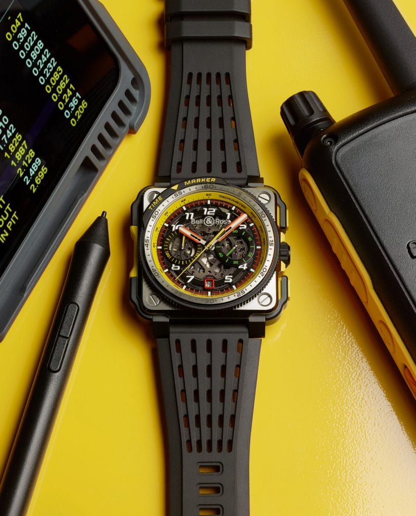 La nouveauté du BR-X1 cette année est l’ajout d’une excroissance dite « time marker » à la lunette. Après un tour particulièrement rapide, de retour dans les stands, le pilote ou son équipe peuvent marquer instantanément l’arrêt de la trotteuse jaune du chronographe en tournant et en alignant son triangle jaune. Après un deuxième tour, les temps respectifs peuvent être instantanément comparés.