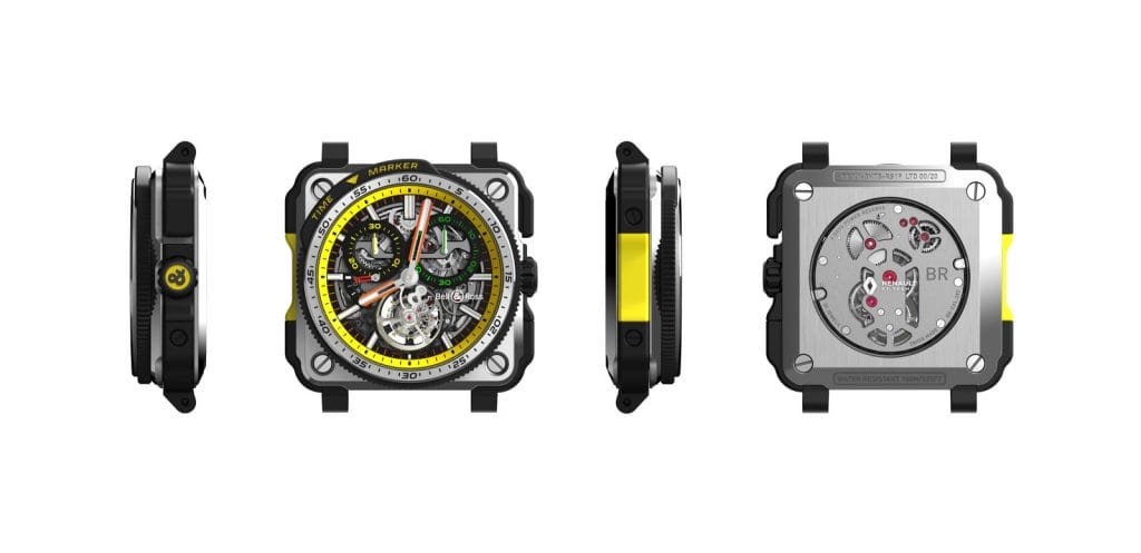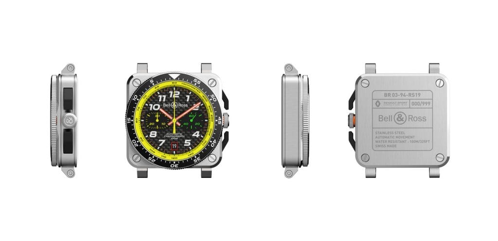 S’appuyant sur le savoir-faire de Bell & Ross en matière de fabrication de montres ultra-fonctionnelles pour les professionnels, la collection R.S.19 Renault F1® Team se fonde sur deux chronographes édités en série limitée, adaptés à l’environnement sans compromis des cockpits de F1® modernes. Toutes deux partagent le même « moteur » et le même langage stylistique, mais sont montés sur deux « châssis » différents et tout aussi emblématiques. La BR V3-94 R.S.19 s’installe dans le boîtier circulaire classique de la gamme « Vintage » de Bell & Ross, désormais décliné dans des proportions XL de 43 mm. La BR 03-92 R.S.19 de 42mm exploite le boîtier carré fonctionnel de la gamme « Instruments ».