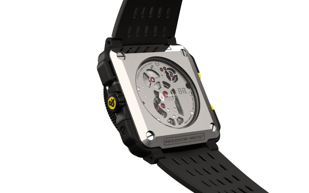 Pour le protéger de tous les chocs possibles en course, le boîtier carré du BR-X1 R.S.19 est entouré d’un « bumper » en céramique microbillée et caoutchouc, conçu comme une coque de protection périphérique jouant le rôle d’un bouclier. Pour une meilleure prise en main lors de l’activation des fonctions du chronographe, même avec des gants, des boutons-poussoirs à bascule en caoutchouc ont été intégrés au boîtier.
