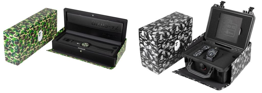 Limité à 25 pièces, la BR03-92 25TH, arbore un bracelet en caoutchouc sur lequel on retrouve le logo Bape gravé et rempli à la main avec de la laque. Cette pièce est vendue dans un coffret PELICAN®, résistant à l’eau, offrant un deuxième bracelet en cuir reprenant le légendaire camouflage gris de BAPE.