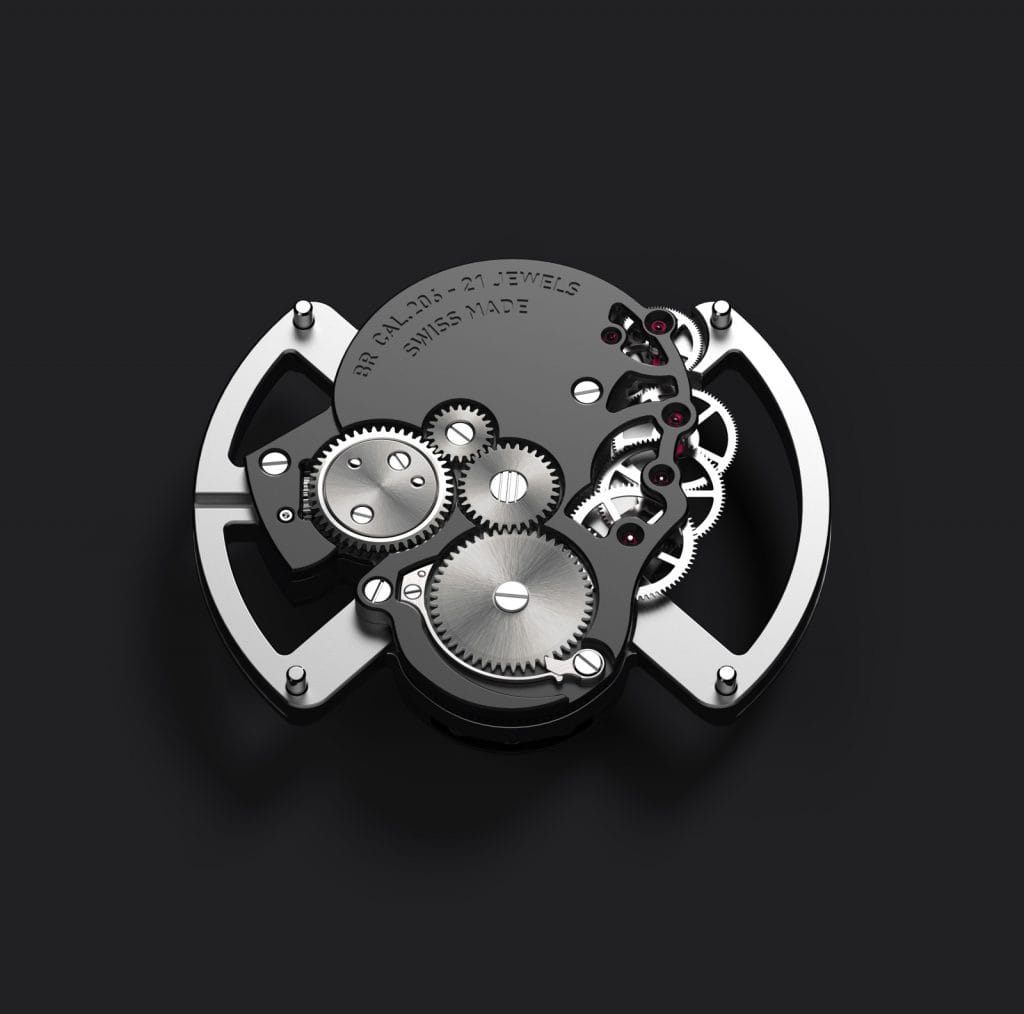 La nouvelle montre de Bell & Ross recèle un puissant caractère. La mâchoire de la tête de mort s’anime lors du remontage. Pour en arriver là, la marque a développé le BR-CAL.206, un calibre 100 % manufacture dont le contour reprend également la forme d’une tête de mort. Ce mécanisme s’adapte parfaitement au boîtier Skull. Dans le prolongement des 4 os, les 4 ponts fixent la platine au boîtier. Tous deux s’assemblent pour former un seul ensemble qui flotte au centre de la montre.