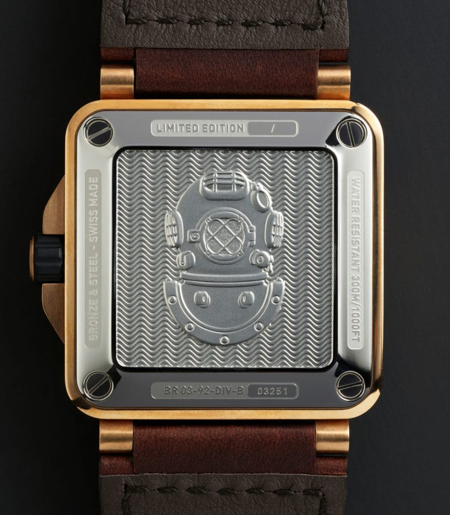 Disponible en édition limitée à 999 exemplaires, la BR 03-92 DIVER RED BRONZE présente sur le fond du boitier une gravure représentant un casque de scaphandrier. A la fois précieuse et résistante, la BR 03-92 DIVER RED BRONZE est pleine de caractère et conçue pour accompagner l’aventurier gentleman à la fois sur terre et en mer. La quête d’excellence, d’innovation et de défis de Bell & Ross se confirme à travers cette élégante BR 03-92 DIVER RED BRONZE.