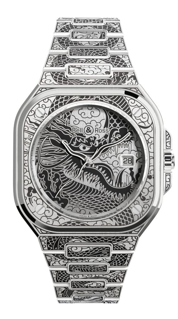 En horlogerie, la gravure est traditionnellement considérée comme le premier enrichissement non fonctionnel d’une pièce d’horlogerie. Avec sa nouvelle BR 05 Artline Dragon, Bell & Ross rend hommage à la culture chinoise et à son art de la gravure, et repousse encore un peu plus loin la maîtrise des techniques de l’art horloger. En effet, la réalisation du boîtier et des maillons du bracelet intégral de la montre BR 05 Artline Dragon utilise une technique exceptionnelle de gravure au laser. Pour le bracelet, cela suppose de graver individuellement chaque maillon, avant l’assemblage. Aucune erreur n’est tolérée. La précision doit être parfaite pour que le motif ne soit pas déformé. Chaque maillon est à lui seul une prouesse. La continuité du dessin est assurée d’un composant à l’autre.