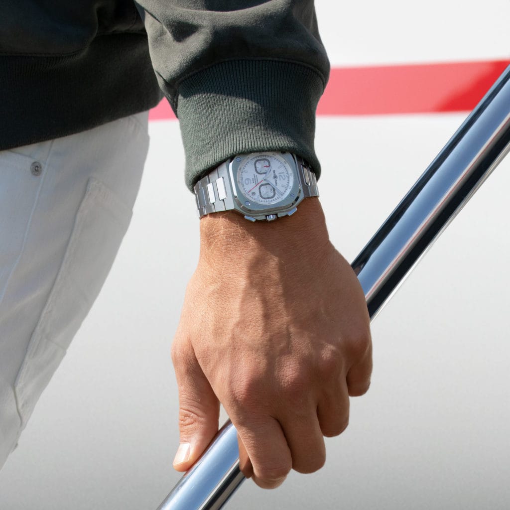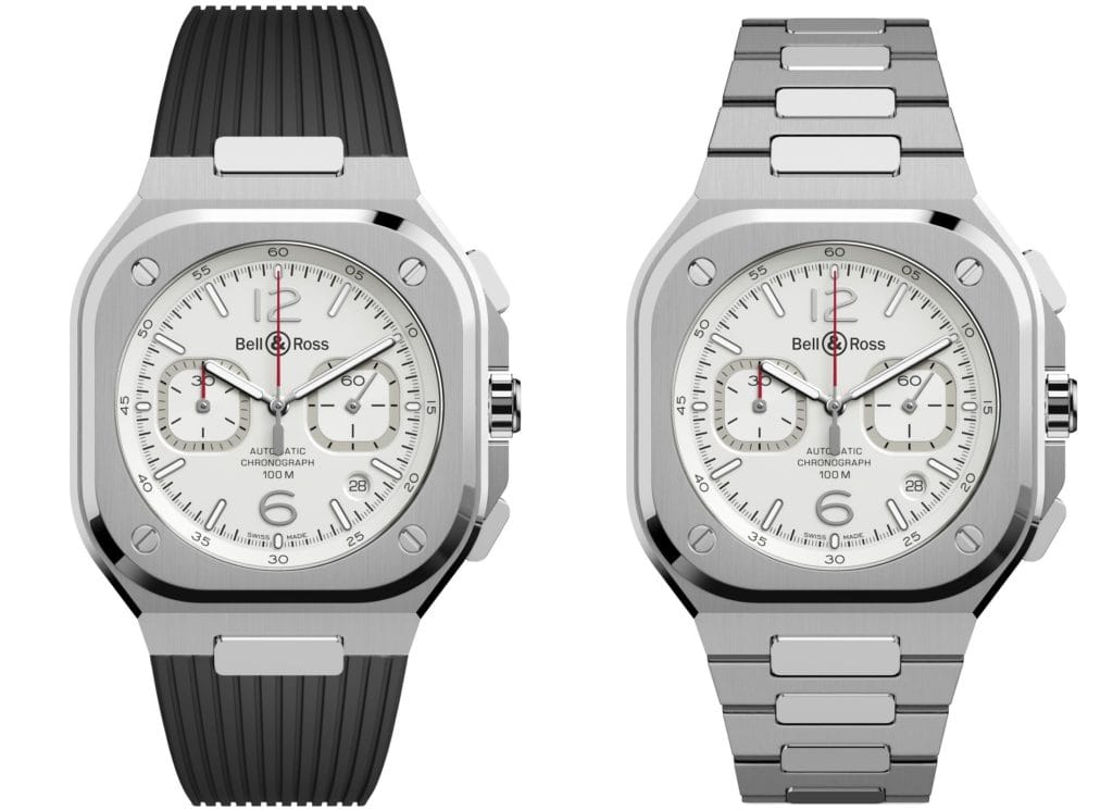 Ce précieux instrument de mesure allie les codes esthétiques de Bell & Ross au raffinement technique de son horlogerie haut de gamme. Les lignes de son boîtier de 42 mm combinent le rond et le carré, les formes géométriques de base qui constituent l’identité de la marque Bell & Ross. Après avoir présenté des versions chronographes à cadran noir et bleu – couleurs signatures – Bell & Ross a imaginé une couleur, aux antipodes de celles existantes, et s’est axée sur des tons clairs. Une alternative et un complément aux cadrans plus sombres déjà existants au sein de la collection.