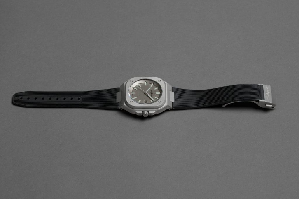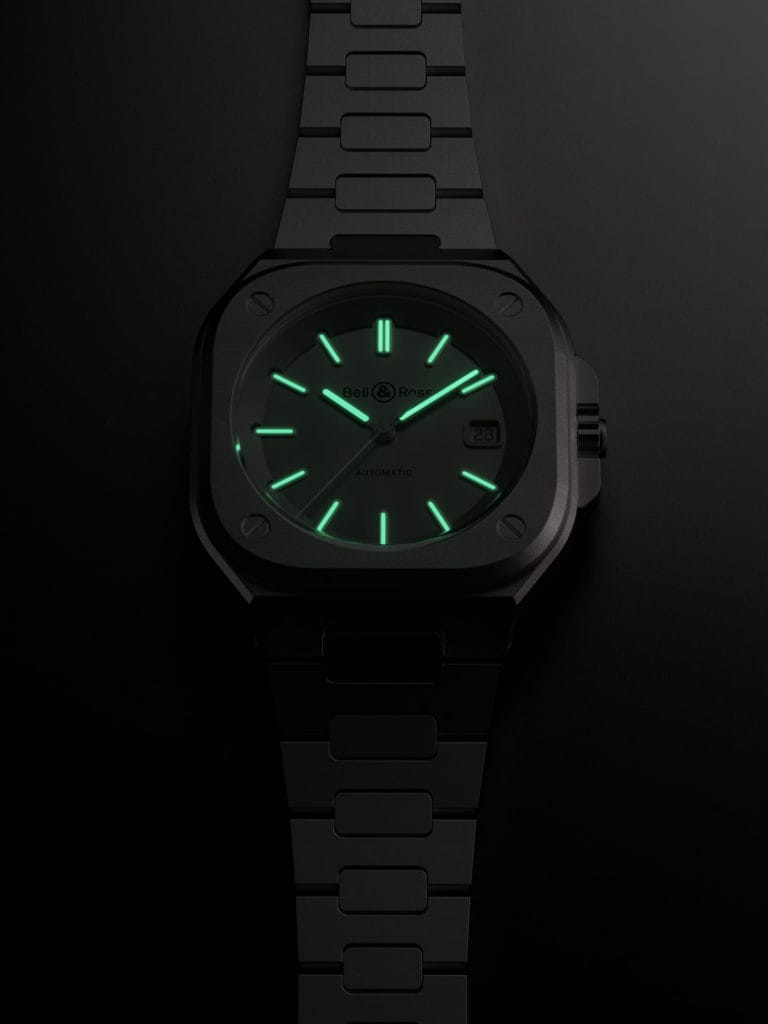 La BR 05 Horolum reprend de la première BR 03-92 Horolum, l’acier microbillé de son boîtier et l’habillage photoluminescent des index de son cadran.