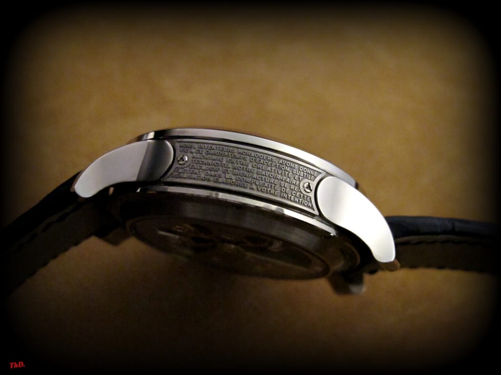 Les platines et les ponts sont en maillechort grenés et perlés avec traitement nickel-palladium et anglages polis. Les cadrans sont en or, noirs ou argentés, avec appliques. L’ensemble prend place dans un boîtier en platine 950 ou en or rouge 5N de 43,50 mm de diamètre pour une hauteur de 16,11 mm. Glaces saphir bombées asymétriques pour le côté cadran et pour le dos du boîtier. Bracelet noir cousu main avec boucle déployante en or rouge 5N ou en platine 950.