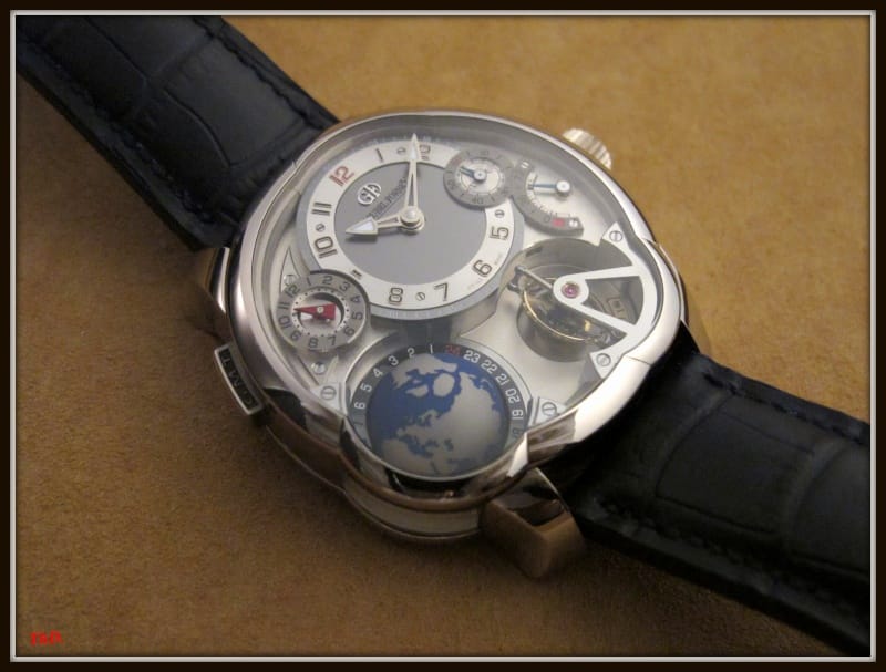 Affichage GMT du 2e fuseau horaire • Tourbillon 24 Secondes • affichage de l’heure universelle terrestre par rotation du globe • affichage de l’heure universelle sur 24 fuseaux • affichage de l’heure d’été • indicateur des villes appliquant l’heure d’été • affichage jour / nuit • indicateur de la réserve de marche • heures, minutes • petite seconde• poussoir GMT • fenêtre latérale sur l’équateur