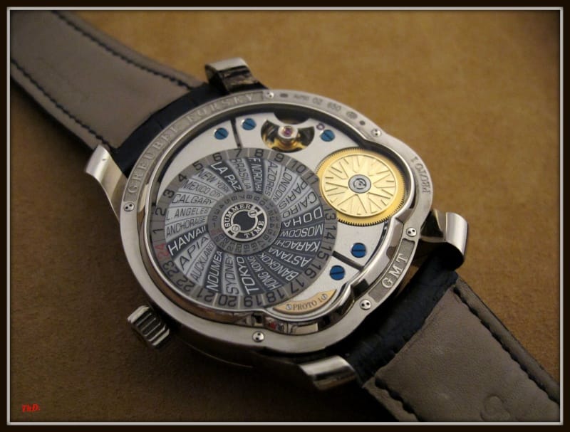 Au dos de cette œuvre d’art horlogère, se trouve l’heure universelle des 24 fuseaux horaires grâce à un disque proposant 24 villes correspondantes, permettant ainsi une information claire. A noter la différenciation de couleurs des cartouches pour les villes bénéficiant (ou pas) d’un changement heure été/hiver, toujours dans un but de lisibilité de l’information.