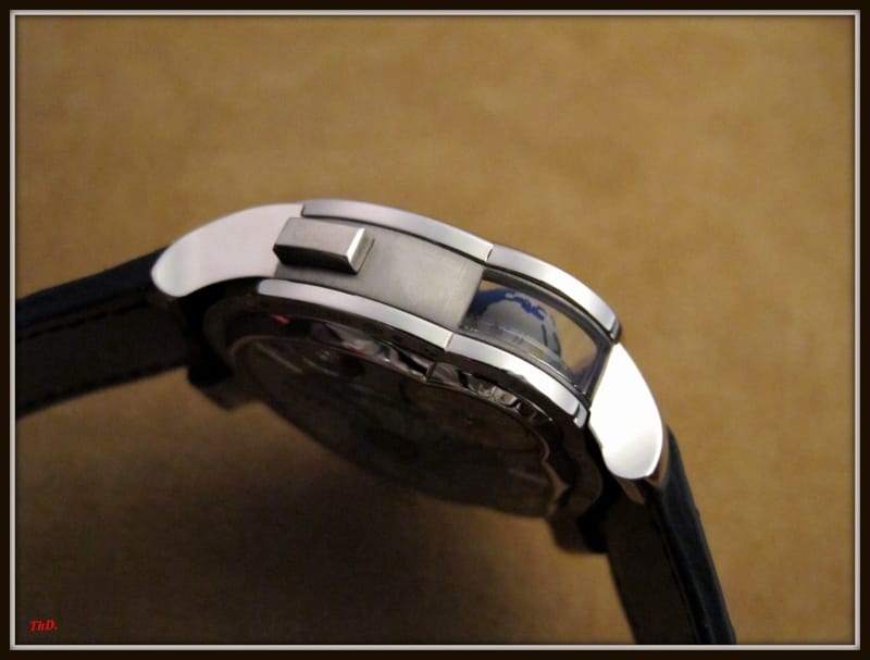 La tranche, grâce à un saphir, permet à son possesseur d’apprécier la tridimensionnalité du globe terrestre. A noter que la rotation s’effectue dans le sens contraire des aiguilles de la montre, soit dans le sens naturel de la rotation terrestre.