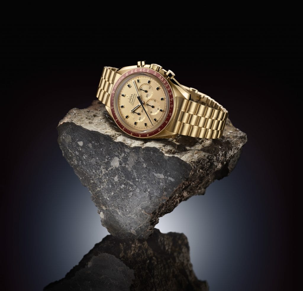 Il s’agit plus préisément d’un modèle en acier inoxydable surmonté d’une lunette en Or Moonshine 18K frappé d’une échelle tachymétrique en Céragold sur céramique noire. Le compteur à 9h se compose d’une plaque en Or Moonshine ornée d’un dessin gravé au laser représentant Edwin « Buzz » Aldrin qui descend du module lunaire. Sur le fond du boîtier se trouve une image gravée au laser de l’empreinte de Neil Armstrong sur une plaque noircie dont la texture évoque la surface de la Lune. Elle est entourée de la phrase « That’s one small step for man, one giant leap for mankind » – (« C’est un petit pas pour l’Homme, mais un grand pas pour l’Humanité ») en lettres plaquées Or Moonshine. Produite en édition limitée à 6969 pièces, la montre est équipée du calibre Omega Co-Axial Master Chronometer 3861.