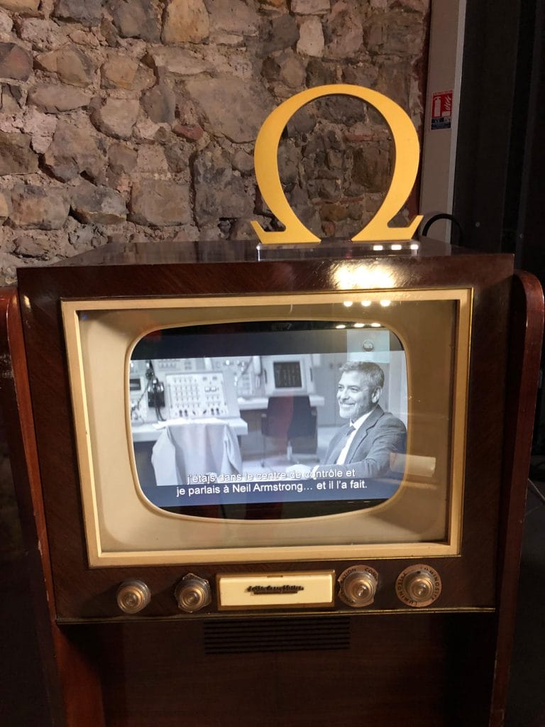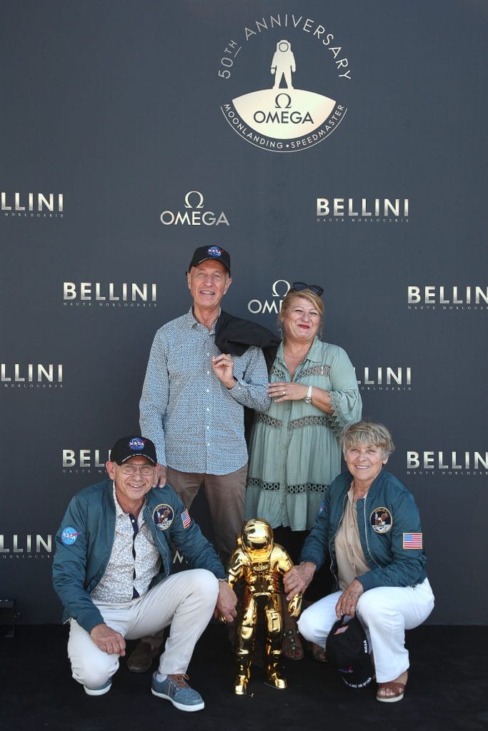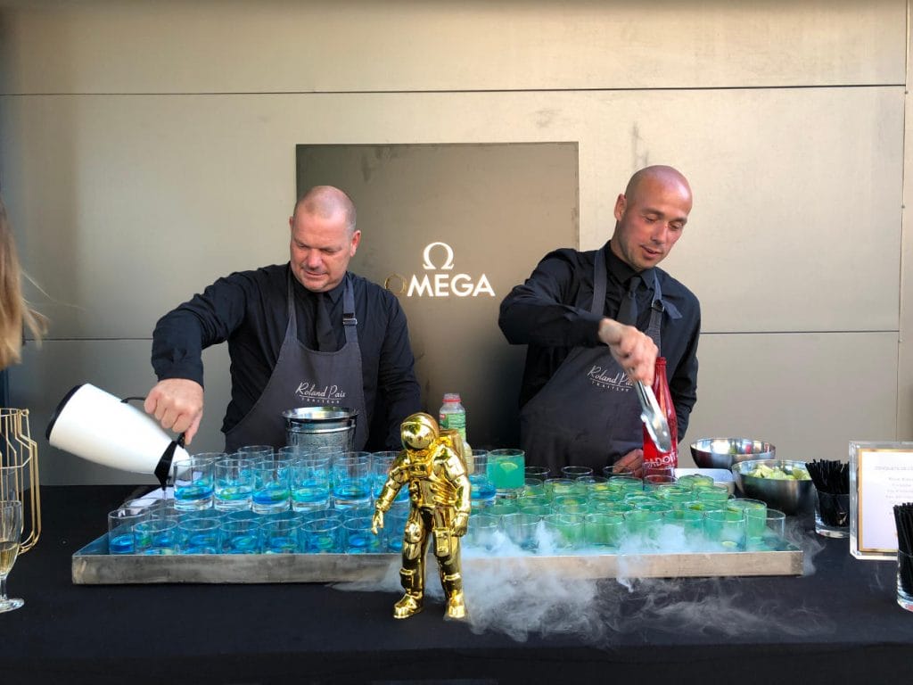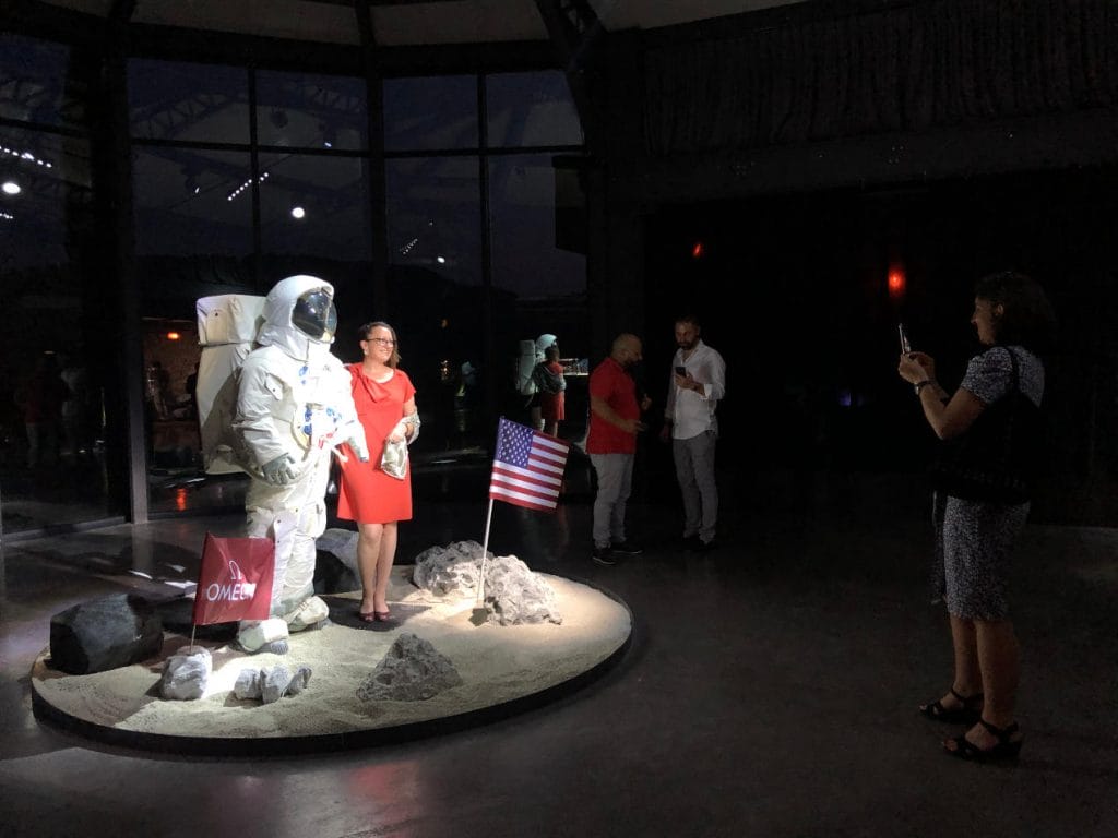Quant aux animations, Omega et Bellini ont « régalé » leurs invités. Pas moins de 4 espaces photo souvenirs étaient prévus. Un photocall traditionnel était installé à l’extérieur, dés l’arrivée des invités. Un autre espace dont les traces dorées au sol menaient à un cosmonaute d’or semblait représenter la marque, aujourd’hui. À l’iontérieur du batiment de verre du domaine se trouvait un salon des années 60 où une télévision nous permettait de suivre l’alunissage dans une ambiance telle qu’elle existait en 1969. Enfin, une représentation du sol lunaire attendait les invités pour immortaliser leur présence aux côtés d’un mannequin représentant Buzz Aldrin que l’on pouvait reconnaître au détail essentiel de la soirée : son poignet.